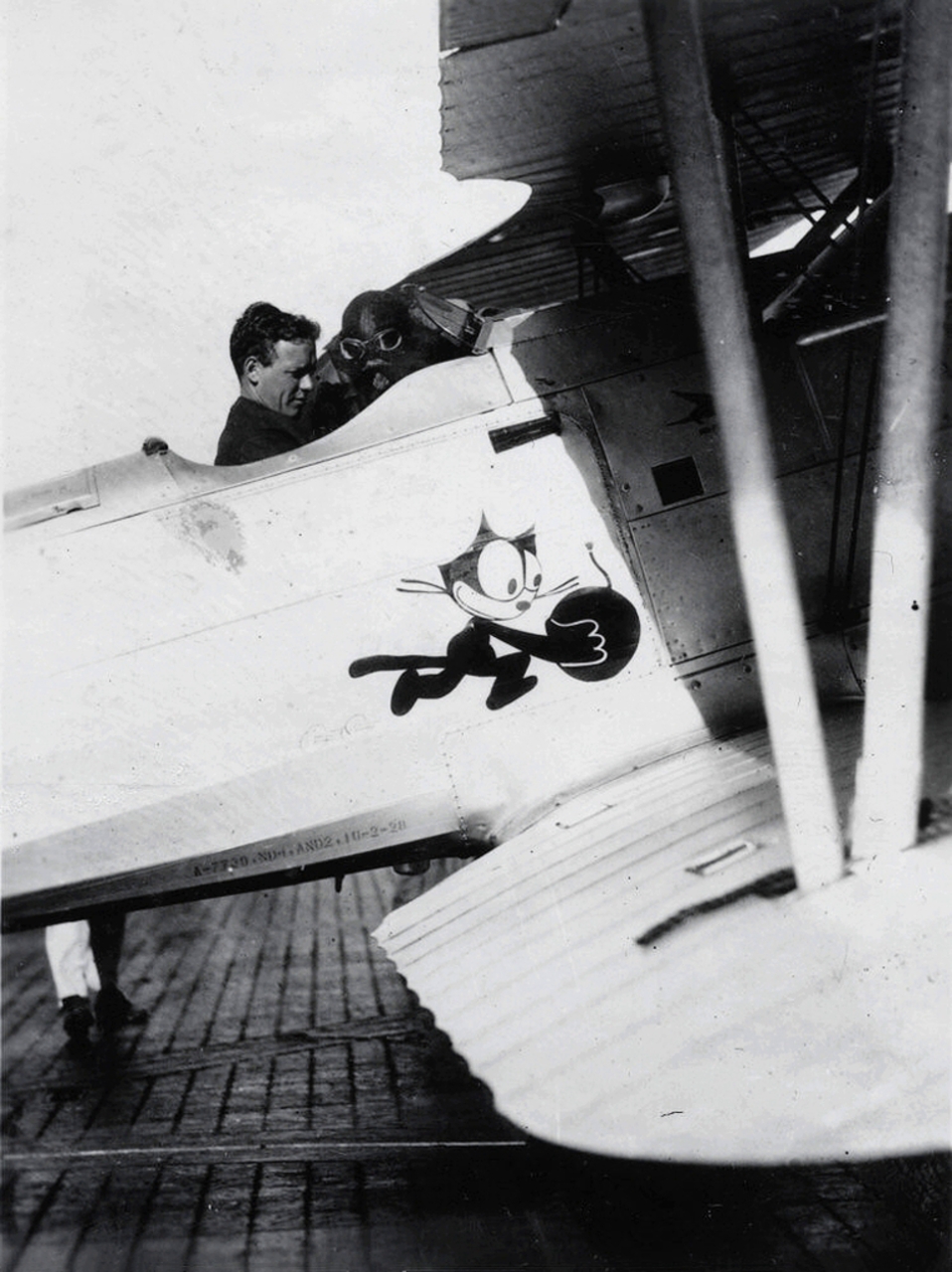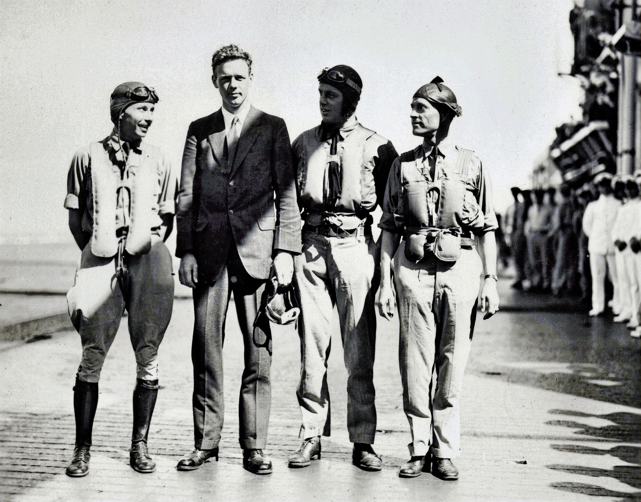 149k | Hell Divers is a Metro-Goldwin-Mayer film released in 1932, directed and produced by George Hill, with Wallace Beery, Clark Gable, Conrad Nagel, Dorothy Jordan, Marjorie Rambeau, and Marie Prevost. It contains real footage shot aboard Saratoga, and some film frames were censored by inserting black bars at the bottom, to hide details of the arresting hooks and wires—at the time, they represented cutting-edge naval aviation technology. VF-1B "High Hatters" pilots "doubled" for the actors in the flying scenes. NS020300: Theatrical release poster. NS020300a: Actor Conrad Nagel (left) and LT(JG) Herbert S. Duckworth, John's father. NS020300c: LT(JG) Edward P. "Bud" Southwick (left) and actor Wallace Beery (right, facing camera). NS020300d: (Left to right) Actor Clark Gable, LT(JG) "Jimmy" Thach, and John's mom. NS020300e: LT(JG) Edward P. Southwick (left) and actor Wallace Beery. Note the VF-1B "High Hatters" squadron insignia. NS020300f: (Left to right) Actor Cliff Edwards; LT(JG) John S. "Jimmy" Thach, later ADM; actor Clark Gable; actor (and USNR officer) Wallace Beery; LT(JG) Herbert S. Duckworth, later VADM; and LT(JG) Edward P. "Bud" Southwick, later RADM. They are standing by a Curtiss F8C-4 Helldiver aircraft of Fighting Squadron 1B, at Naval Air Station, North Island, California, 16 September 1931. |