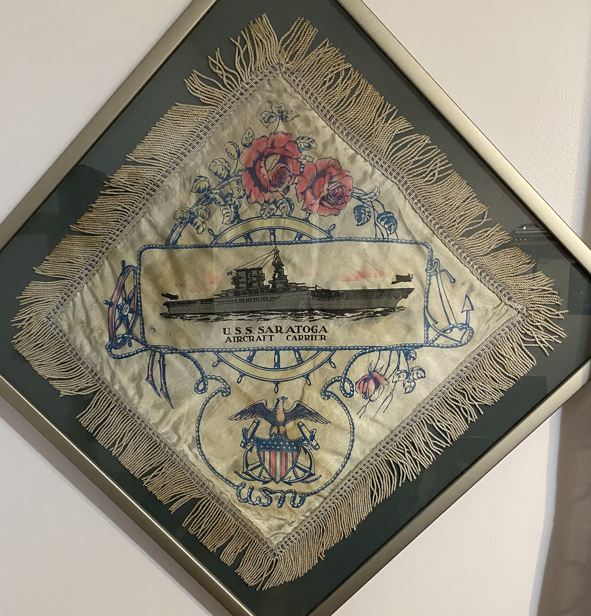 935k | USS Saratoga (CV-3), pillow case kept by Ulric Rocheleau. Ulric enlisted prior to World War II and served aboard Saratoga during the war. |