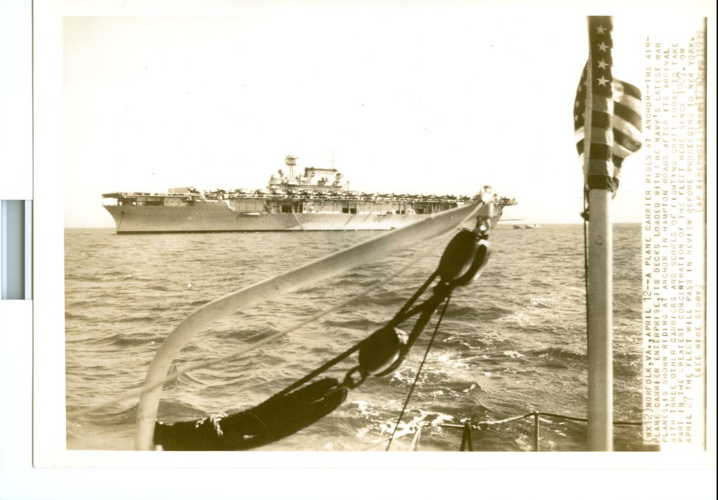 105k | "Norfolk, Va., April 12 [1939]—A plane carrier rides at anchor—The airplane carrier Enterprise, its decks loaded with the Navy's latest war planes, is shown riding at anchor in Hampton Roads after its arrival with three other carriers [Lexington (CV-2), Ranger (CV-4) and Yorktown (CV-5)] and scores of fighting craft today to take part in the greatest concentration of the Fleet here since 1907. On April 27 the Fleet will pass in review before proceeding to New York. AP wirephoto WRW41730CPG." Events in Europe, however, reached a crisis, the United Kingdom gathered her fleet in the Mediterranean and the U.S. Fleet was immediately ordered back to the Pacific, six weeks ahead of schedule (see NS020617). The naval review (in connection with the opening of the New York World's Fair early in May) was canceled. |