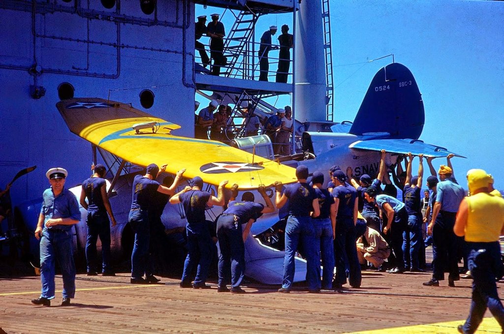 179k | Crew removing plane [SBC-3 Helldiver, # 0524] which has made a slight crash landing aboard the aircraft carrier Enterprise (CV-6) during the US Navy's Pacific Fleet maneuvers in 1940. |