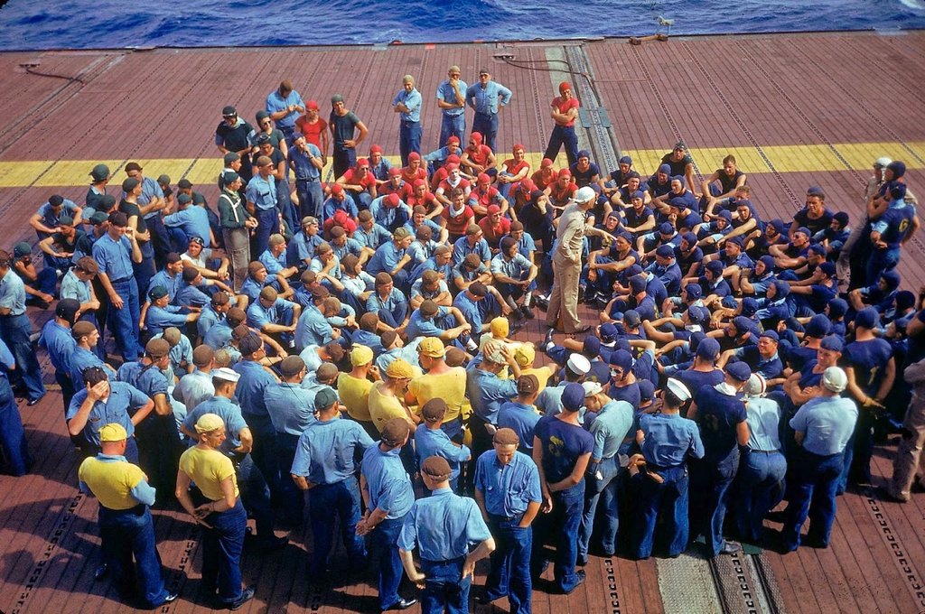 235k | Crew aboard the aircraft carrier Enterprise (CV-6) listening to instructions during the US Navy's Pacific Fleet maneuvers around Hawaii in 1940. |
