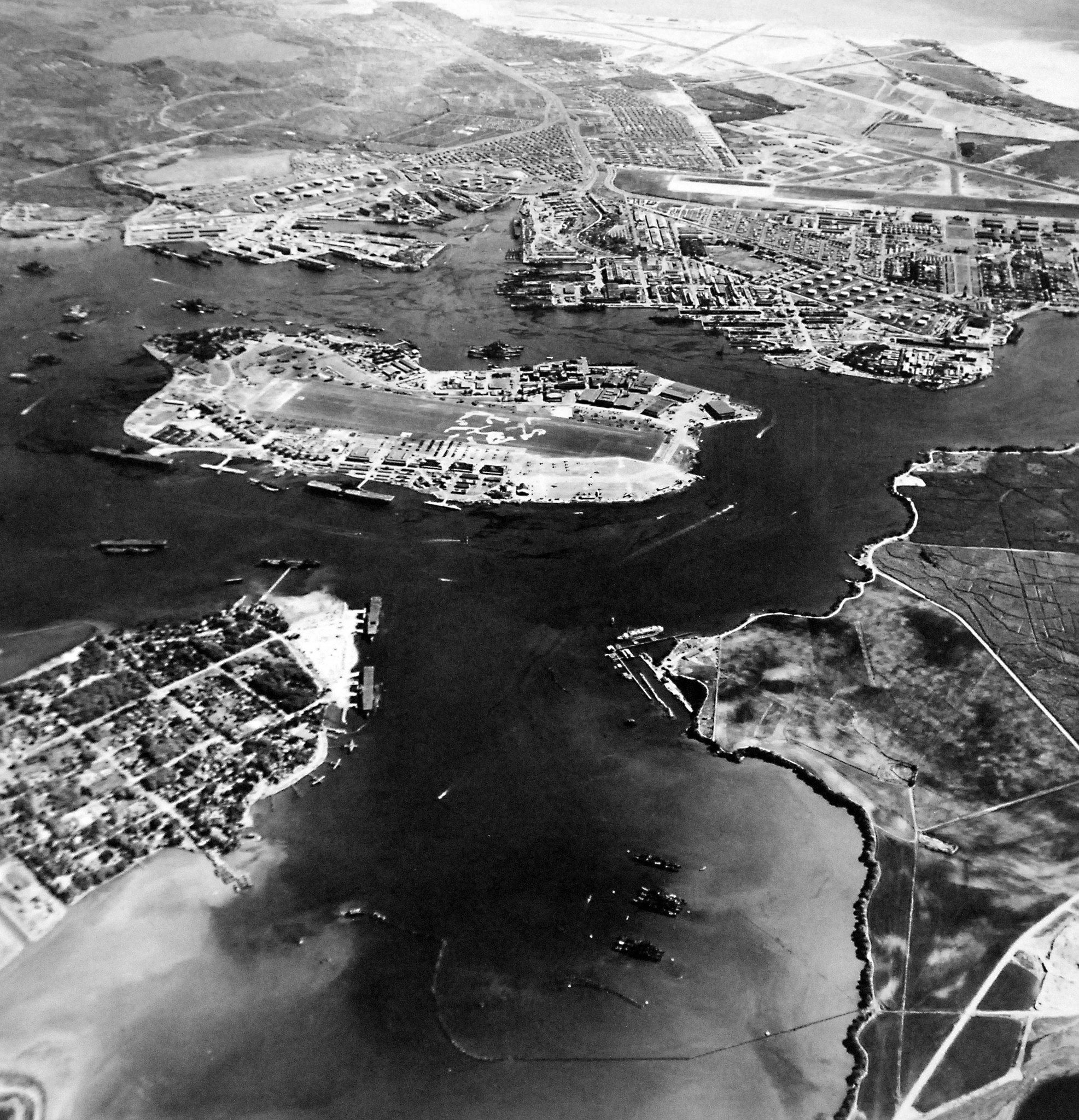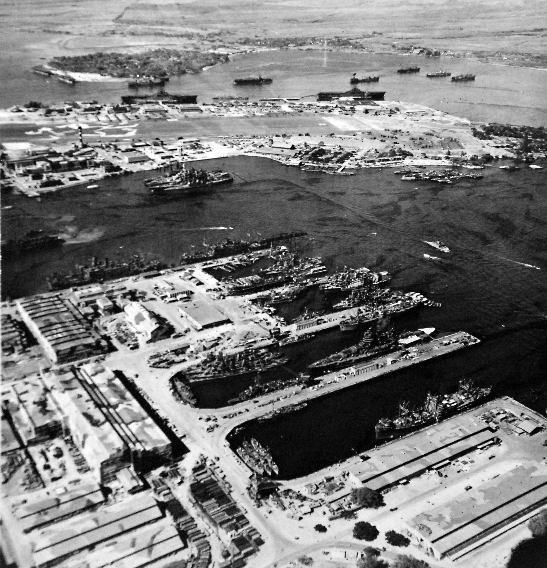 751k | U.S. Navy Yard, Pearl Harbor, Territory of Hawaii. Aerial view of Ford Island, 18 August 1943. Visible aircraft carriers are: