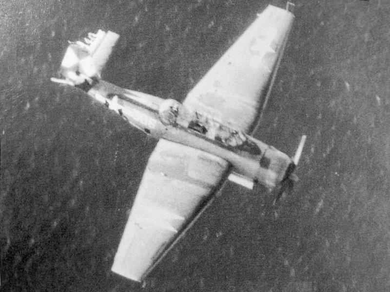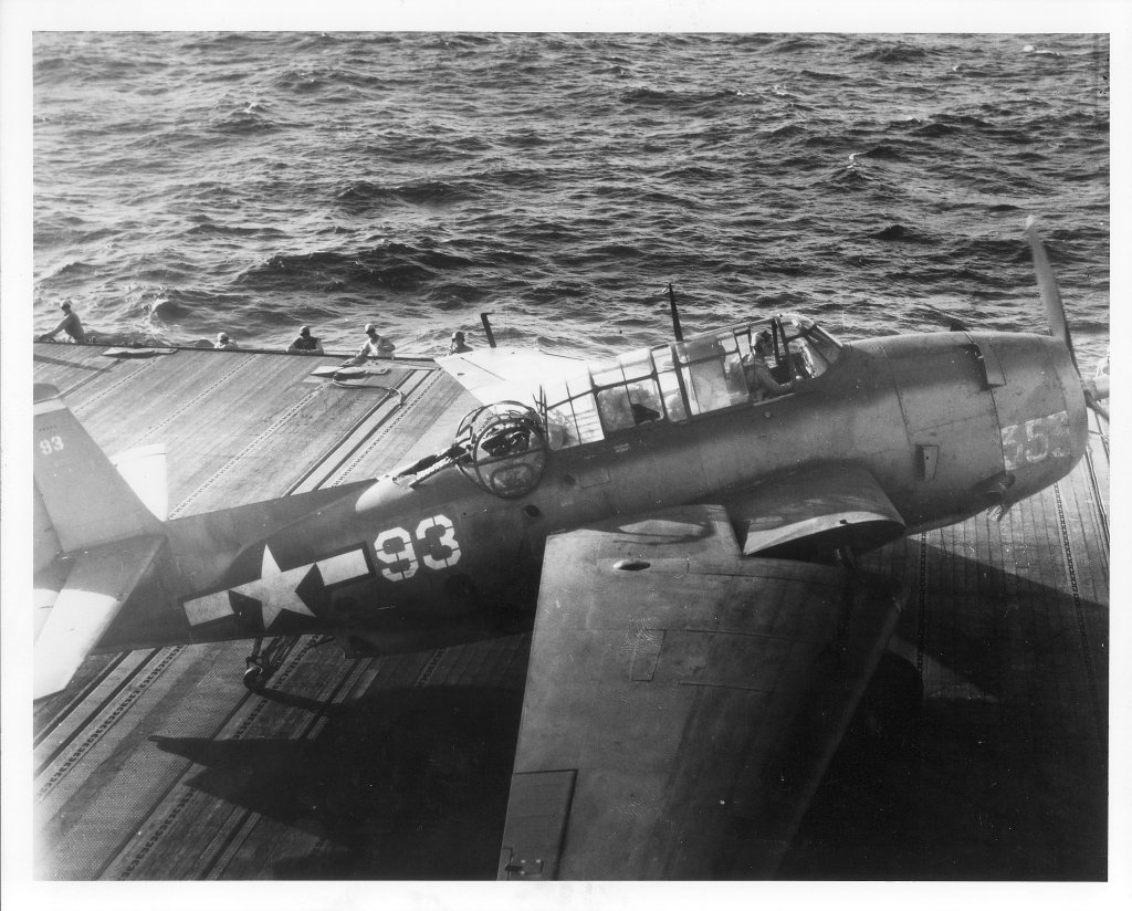 105k | (Poor quality) photo of a VT-83 TBM heading for a water landing after having most of its tail shot away, early-mid 1945. Tough bird! |