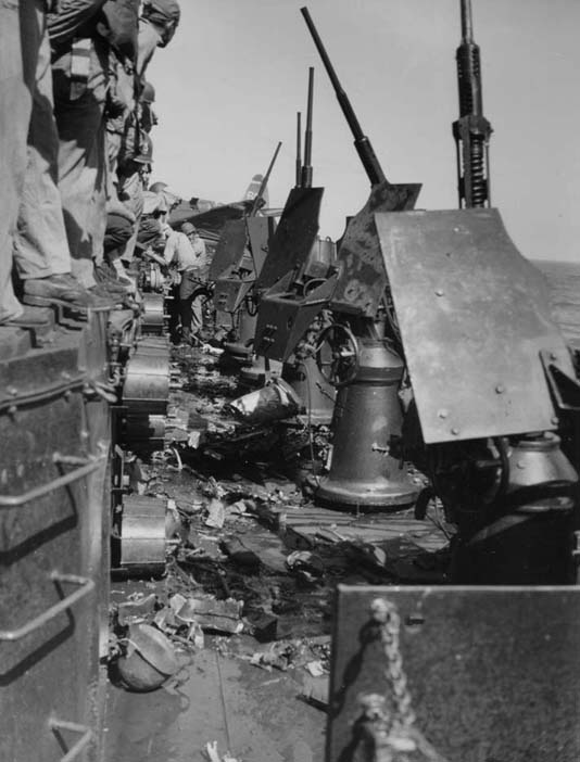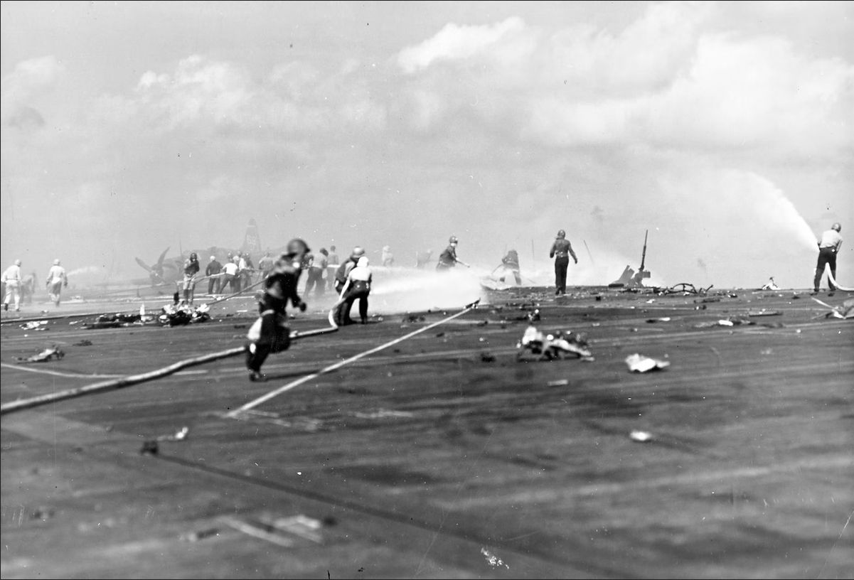 96k | Fire-fighters and scattered fragments of the Japanese kamikaze cover the flight deck of USS Essex (CV-9), 25 November 1944. |