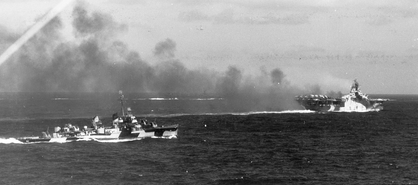 161k | As seen from USS Essex (CV-9), USS Astoria (CL-90), USS Randolph (CV-15), and other units of Task Force 58 steam in the Pacific, circa May 1945. Carrier in the background might be USS Bunker Hill (CV-17). |