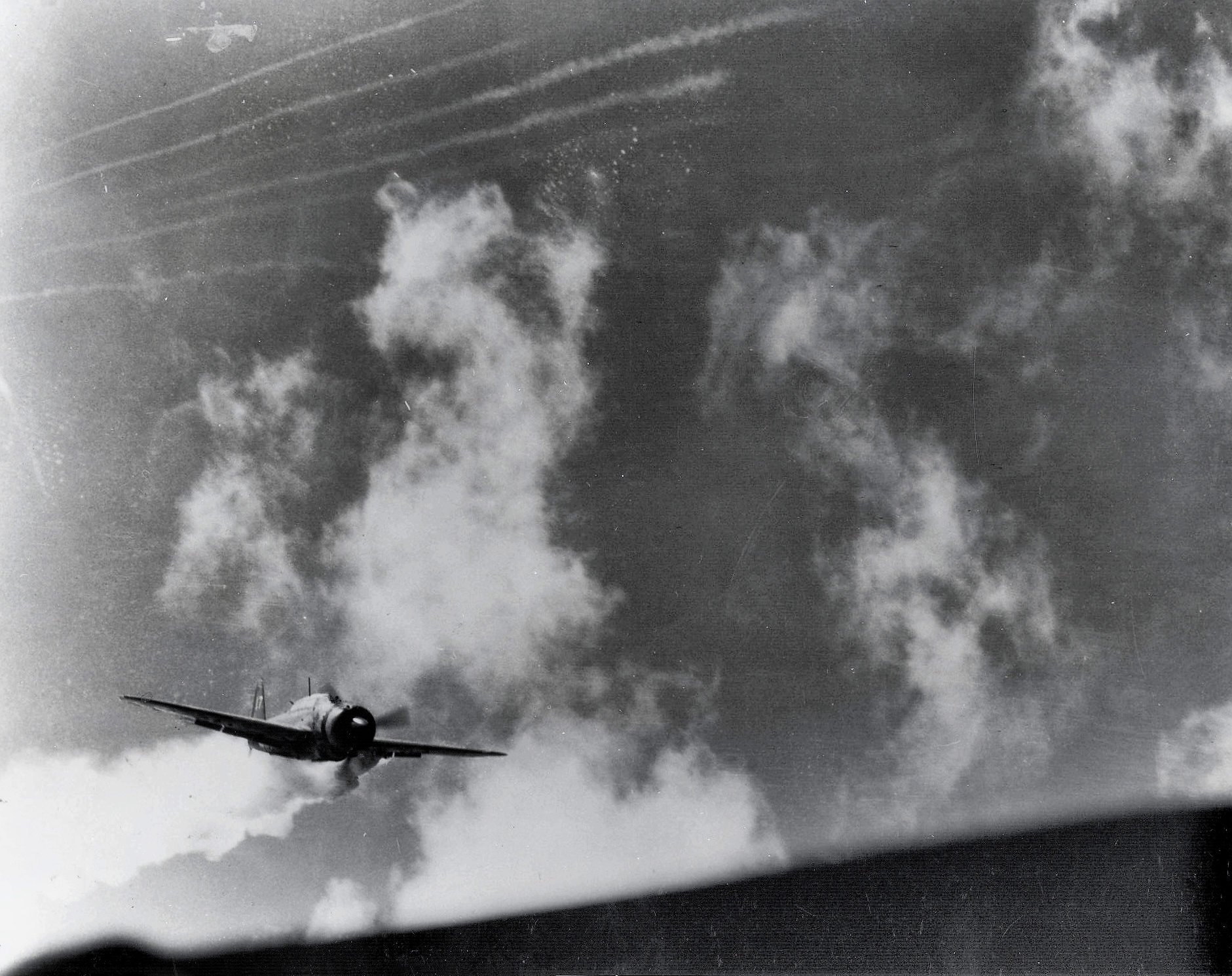 333k | Anti-aircraft bursts from Task Force 58 as a Japanese plane is hit and explodes just beyond USS Essex (CV-9), in an action off Okinawa, Ryukyu Islands, 11 April 1945. Photo taken from USS South Dakota (BB-57). USN photo. |