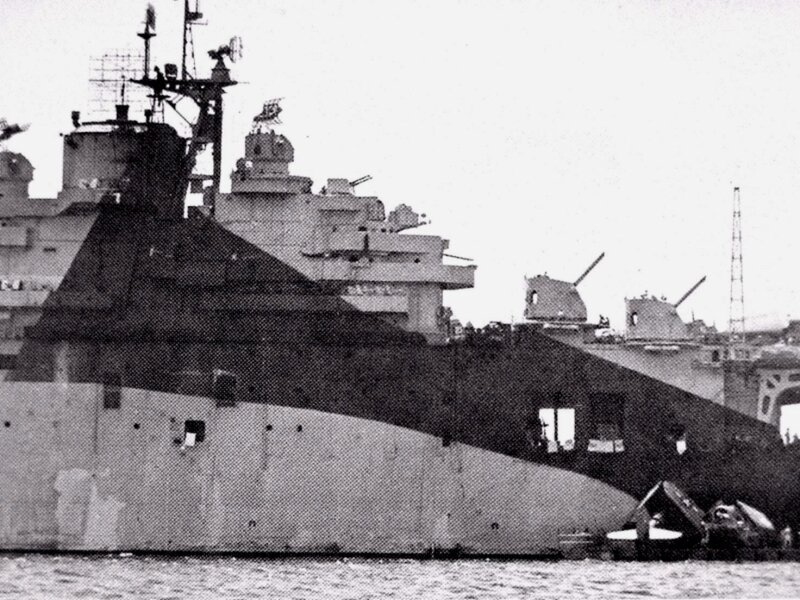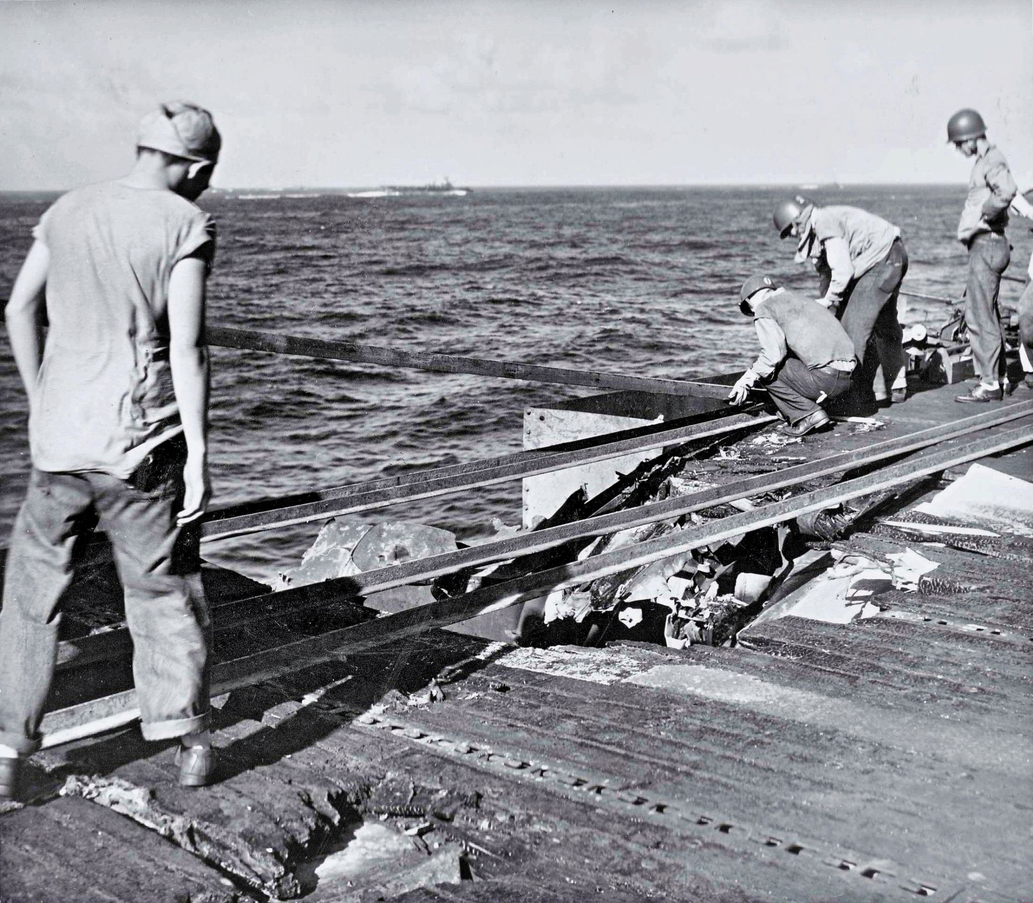 663k | USS Essex (CV-9), 25 November 1944. Repair parties covering over the hole. Flight operations were resumed a few minutes later. |