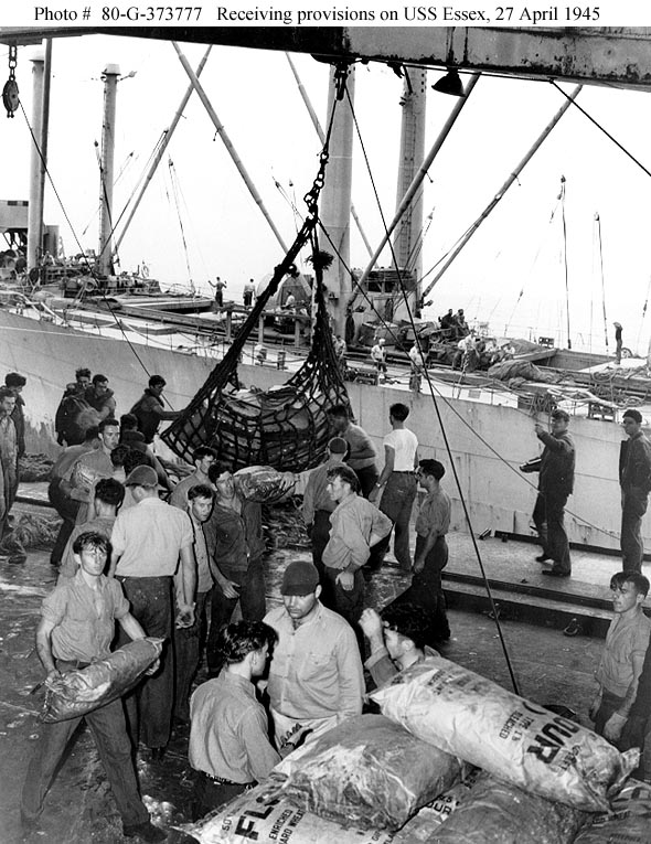 124k | USS Essex (CV-9) receiving provisions via highline from USS Mercury (AK-42) on 27 April 1945, while operating off Okinawa. Essex crewmen in the foreground are stacking bags of flour. Note man on Mercury's forward hatch, directing the hoisting of another load from her hold. Official U.S. Navy Photograph, now in the collections of the National Archives (photo # 80-G-373777). |