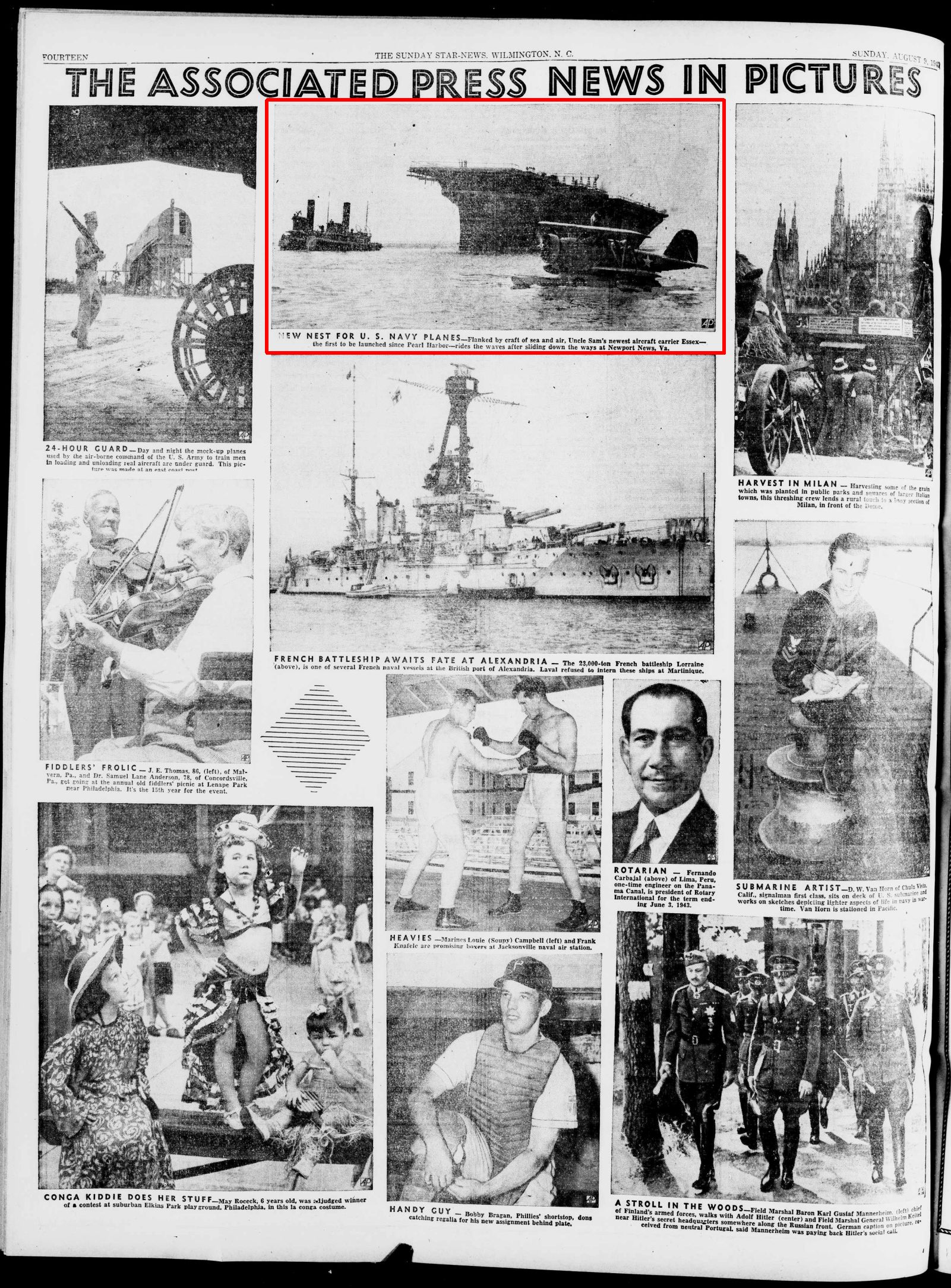 931k | "NEW NEST FOR U.S. NAVY PLANES—Flanked by craft of sea and air, Uncle Sam's newest aircraft carrier Essex—the first to be launched since Pearl Harbor—rides the waves after sliding down the ways at Newport News, Va." The Wilmington Morning Star/The Sunday Star-News, Wilmington, N.C., Sunday, 9 August 1942. |