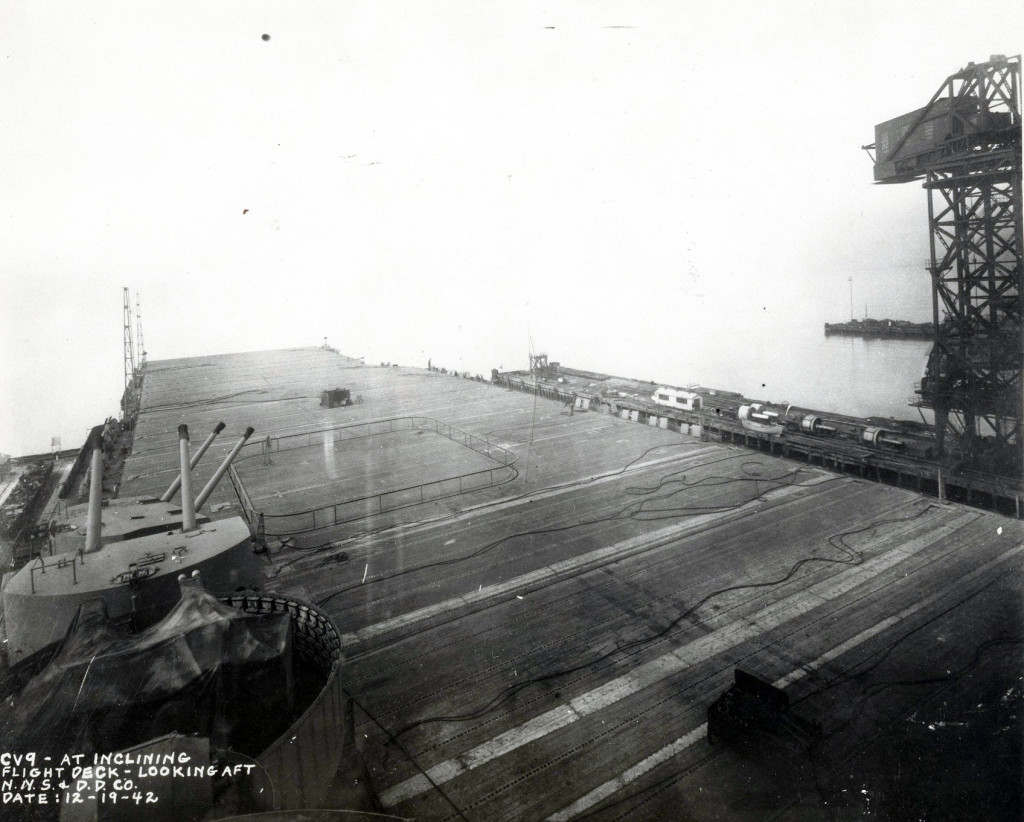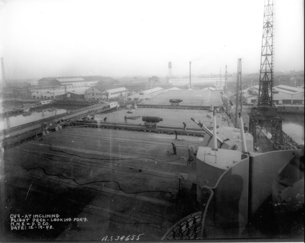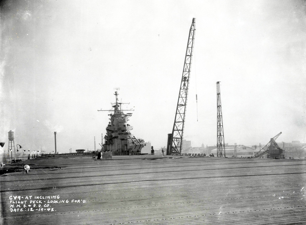 170k | Essex at inclining, 19 December 1942. Flight deck, looking forward. Newport News Shipbuilding & Dry Dock Company photo. |