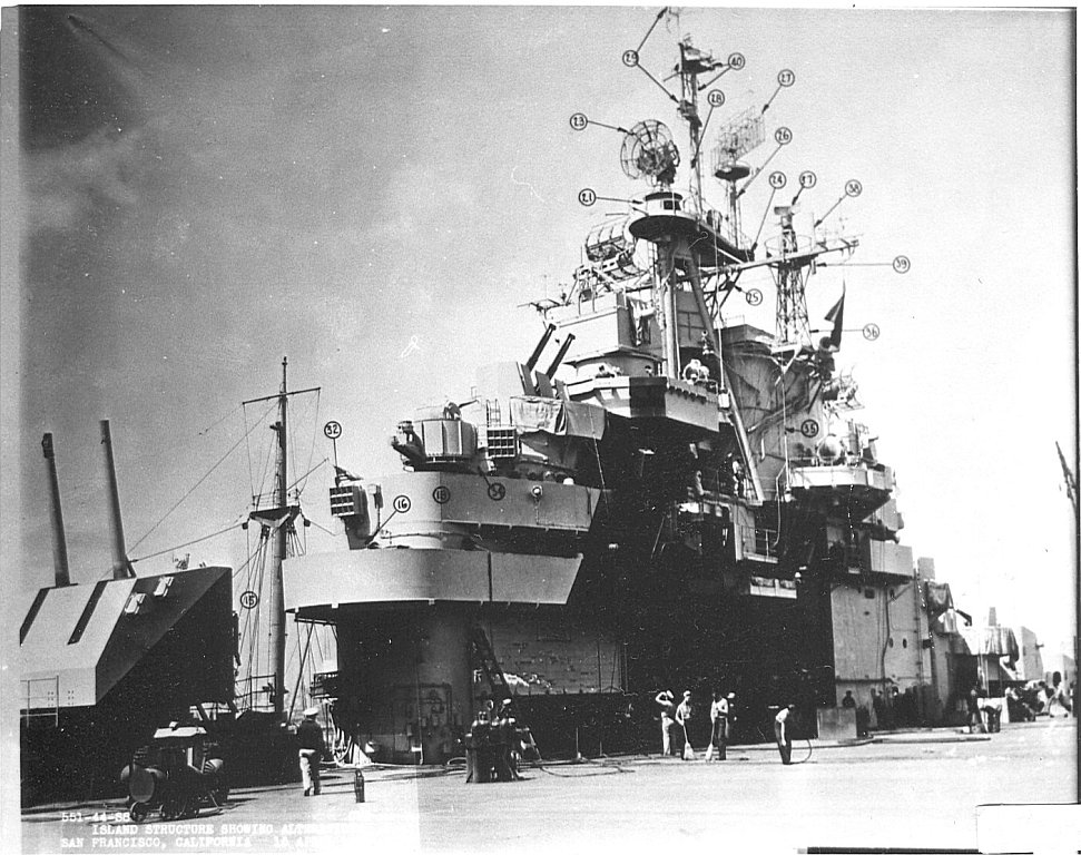 84k | USS Essex (CV-9). View of island. Date and location unknown. |