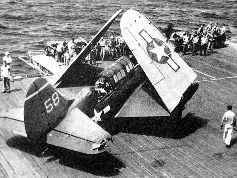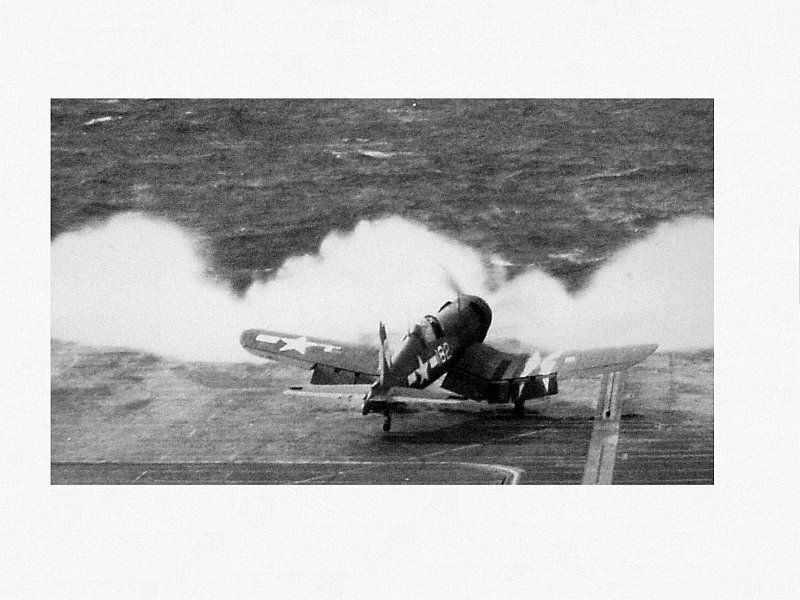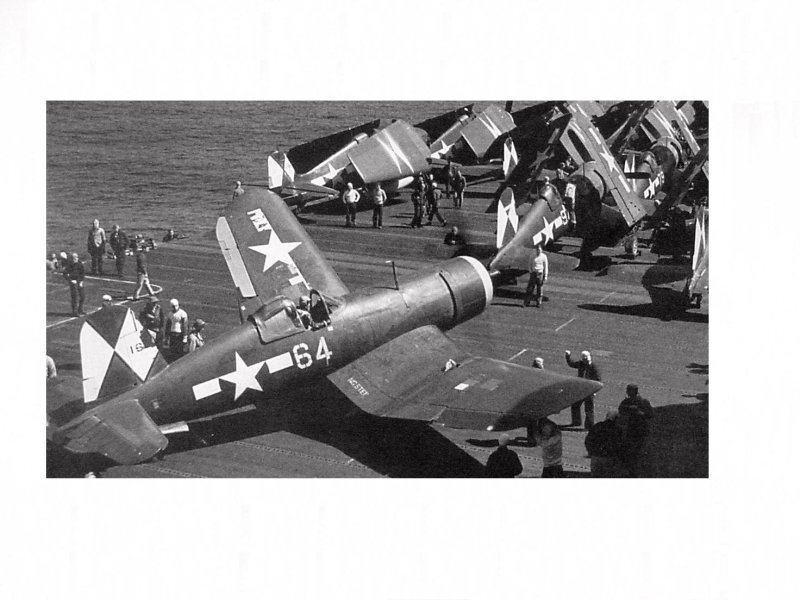167k | A Marine Corps F4U-1D Corsair comes in for a landing aboard the carrier USS Essex (CV-9). Photo USN. From Aircraft Carriers, by Norman Polmar. |
