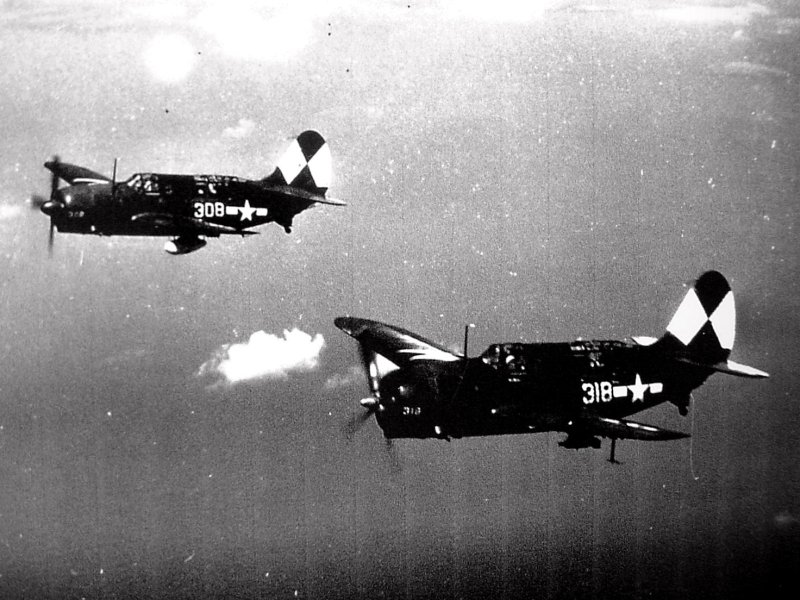 76k | Corsairs from VBF-83 flying from the Essex in March of 1945. Essex had the first F4U-1D/FG-1D's deployed on a fleet carrier. Note that the ship's fighter squadron, VF-83, was equipped with F6F Hellcats. |