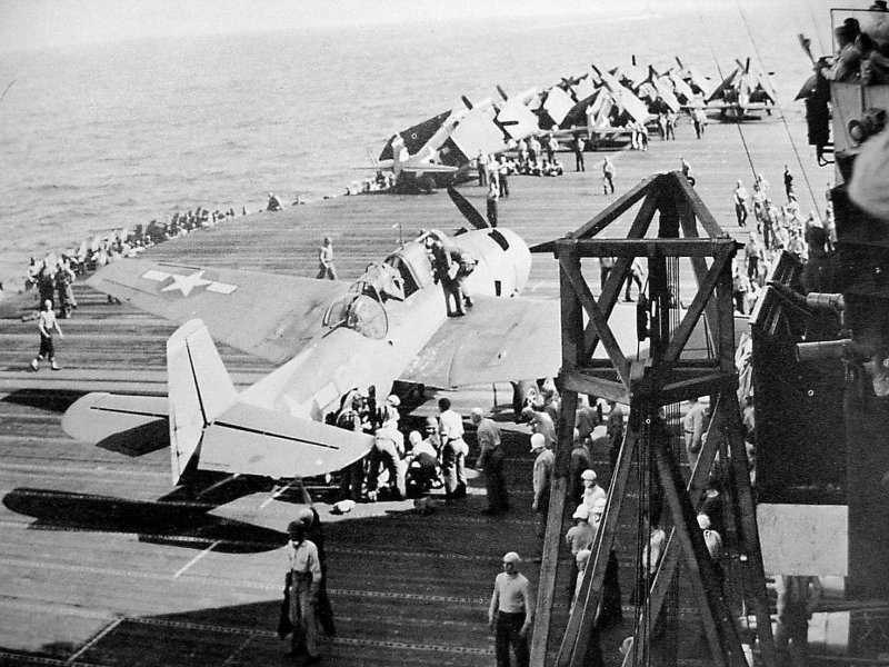 390k | Commander Fitzhugh Lee prior to first take off from USS Essex (CV-9), 16 February 1943. Official U.S. Navy Photograph, now in the collections of the National Archives and Records Administration (NARA), # 80-G-228006. |