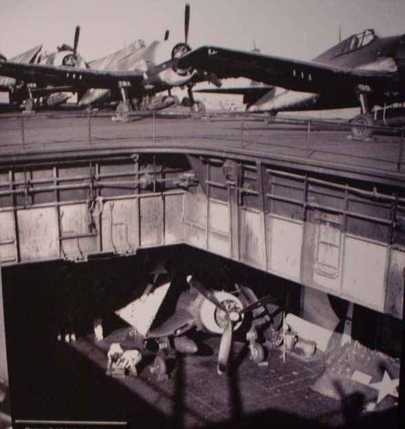 50k | Partial view of USS Essex (CV-9) flight and hangar decks, looking down elevator shaft. Photo by Paul Madden CPHOM. |