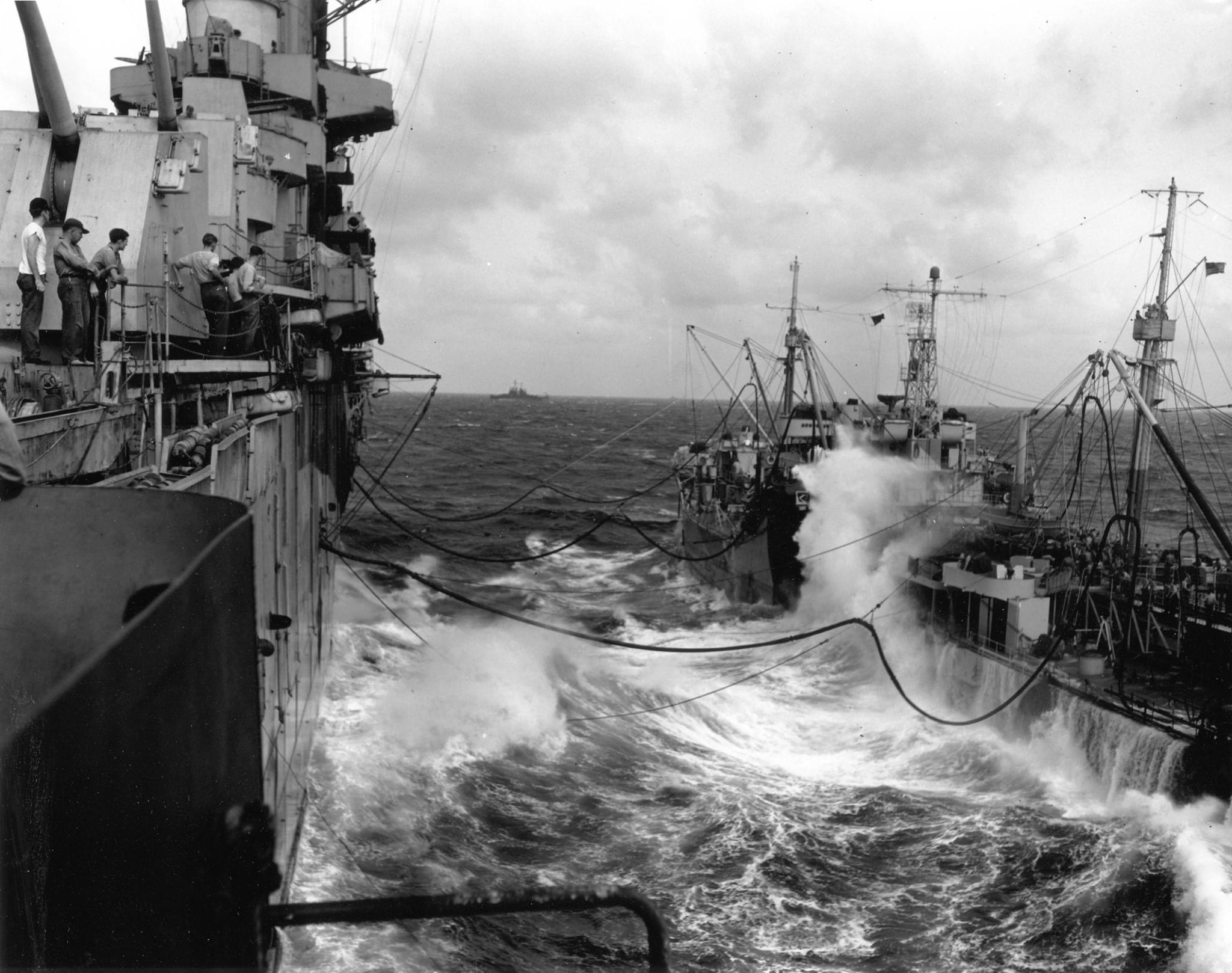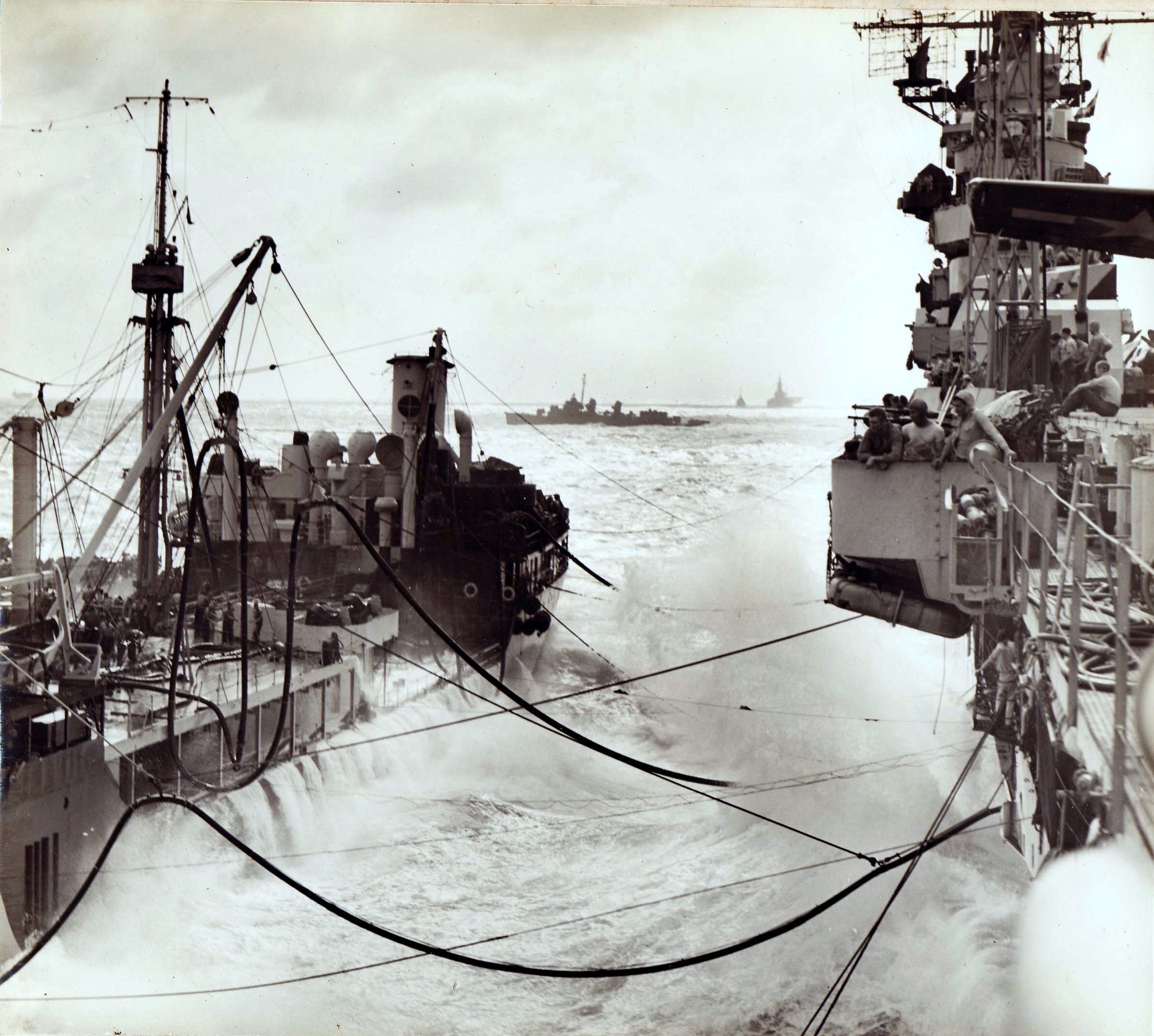 810k | Fuel lines snake across the water between an unidentified fleet oiler and the aircraft carrier USS Essex (CV-9) during underway replenishment between strike operations, circa 1944–1945. With the Pacific theater of operations a wide ranging battlefield consisting of islands surrounded by thousands of square miles of ocean, the ability to replenish the fleet at sea was necessary to support sustained combat operations. This view is on the starboard side of the ship, just forward of the island looking aft. National Naval Aviation Museum photo, # 1983.046.010.008. |