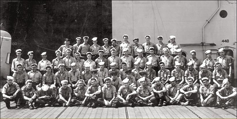 132k | Men of Engineering Department (?), B Division (?), USS Essex (CV-9). Owen Charles Candler is third from right, front row. |