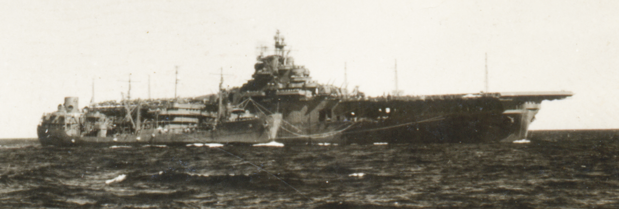 352k | USS Essex (CV-9) underway from Pearl to operations in Southwest Pacific area, as part of Task Group (TG) 53.3. USS Guadalupe (AO-32) is refueling Essex on 1 November 1943. Photos by Bob Lehman, USS John Rodgers (DD-574). |
