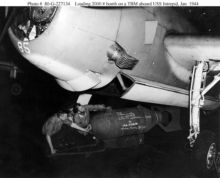 85k | Crewmen prepare to load a 2000-pound general-purpose bomb in the bomb bay of a TBM "Avenger" aircraft, 27 January 1944. Intrepid was then en route to support the invasion of Roi and Namur Islands, Kwajalein Atoll. Note inscriptions on the bomb, from Torpedoman 3rd Class R.A. Franco, addressed to "Hon. Hirohito, Imperial Palace, Tokyo". Also note flame reducer on the plane's exhaust port, and landing gear details. Official U.S. Navy Photograph, now in the collections of the National Archives (photo # 80-G-227134). |