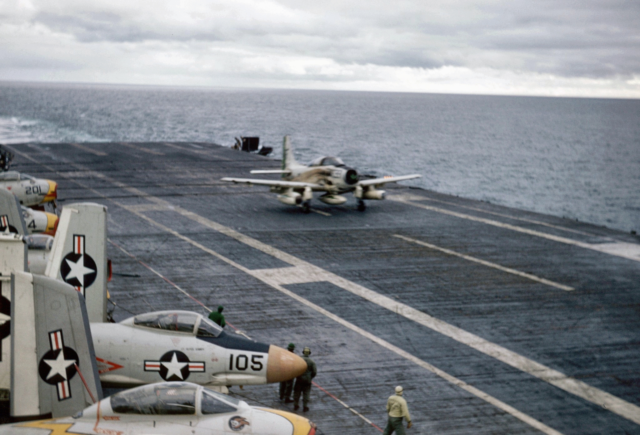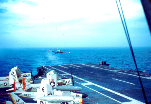39k | An AD-5W Skyraider of VAW-12 "Bats" landing on USS Intrepid. |