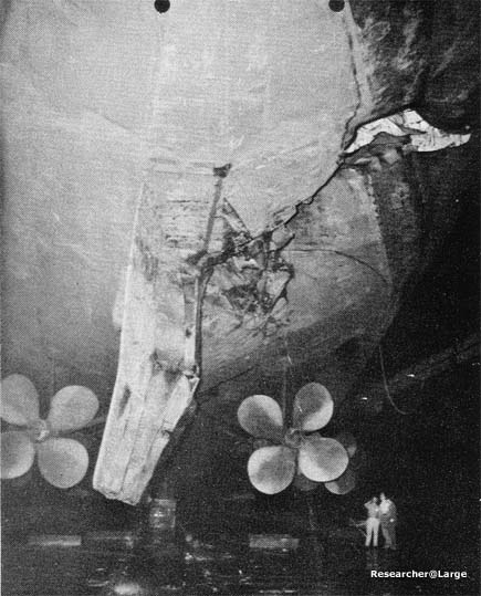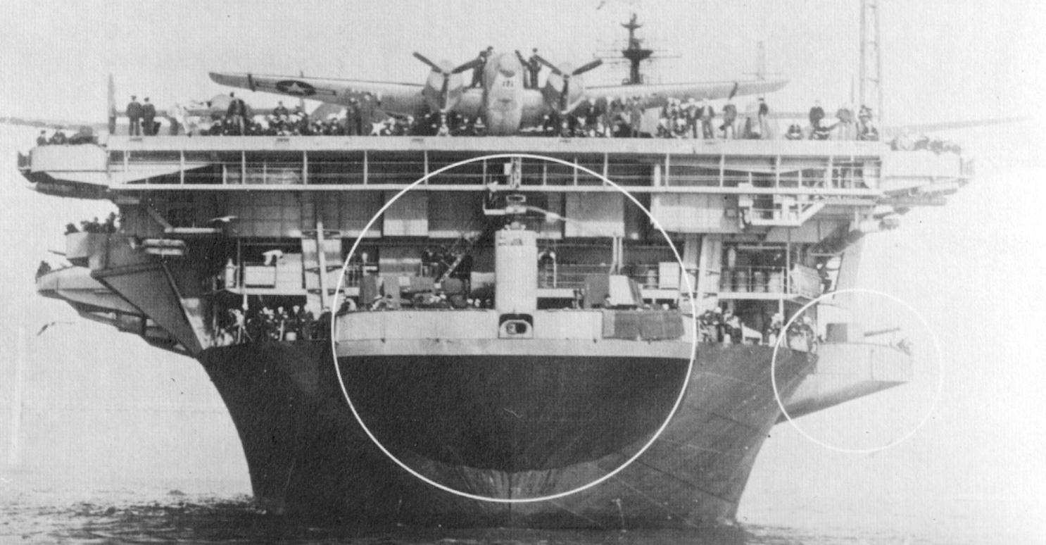 47k | The night of 17 February 1944 an aerial torpedo struck Intrepid's starboard quarter, 15 feet below her waterline, flooding several compartments and jamming her rudder hard to port. By racing her port screw and idling her starboard engine, Captain Thomas L. Sprague kept her on course until two days later strong winds swung her back and forth and tended to weathercock her with her bow pointed toward Tokyo. Sprague later confessed: "Right then I wasn't interested in going in that direction." At this point the crew fashioned a jury-rig sail of hatch covers and scrap canvas which swung Intrepid about and held her on course. Decorated by her crazy-quilt sail, the carrier stood into Pearl Harbor 24 February 1944. Read "Forward repair of rudder damage" at the Researcher @ Large website. |