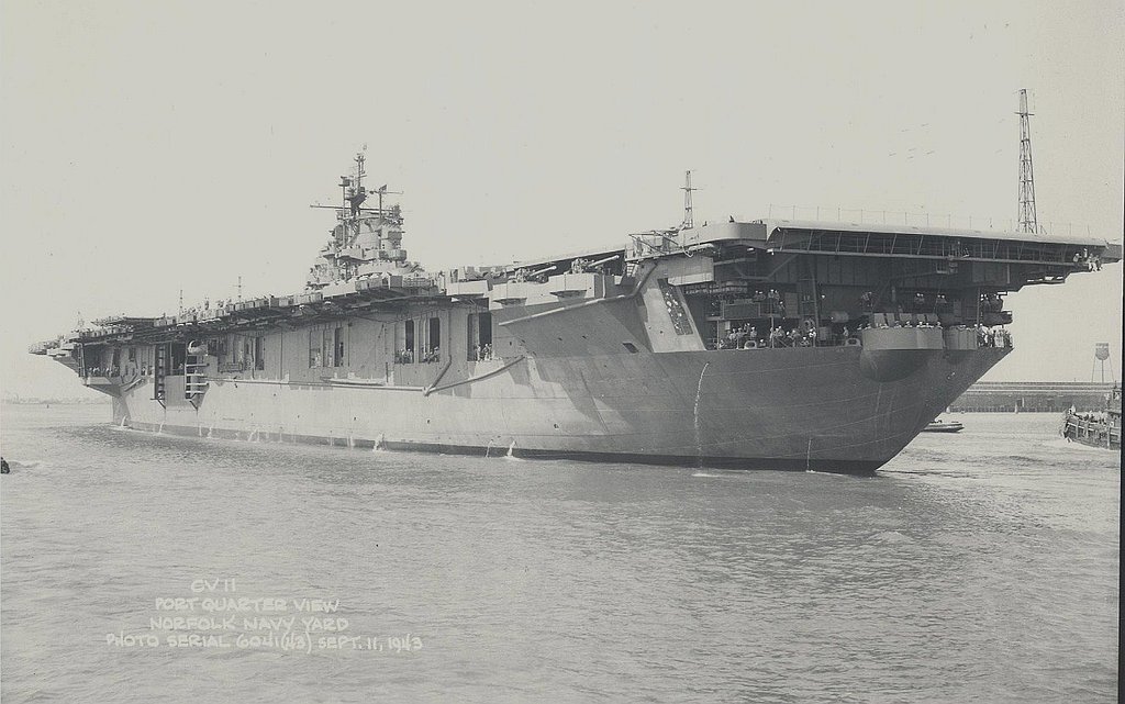 84k | USS Intrepid (CV-11) off Newport News, Virginia, on 16 August 1943, the day she went into commission. U.S. Naval Historical Center Photograph (# NH 53254). |