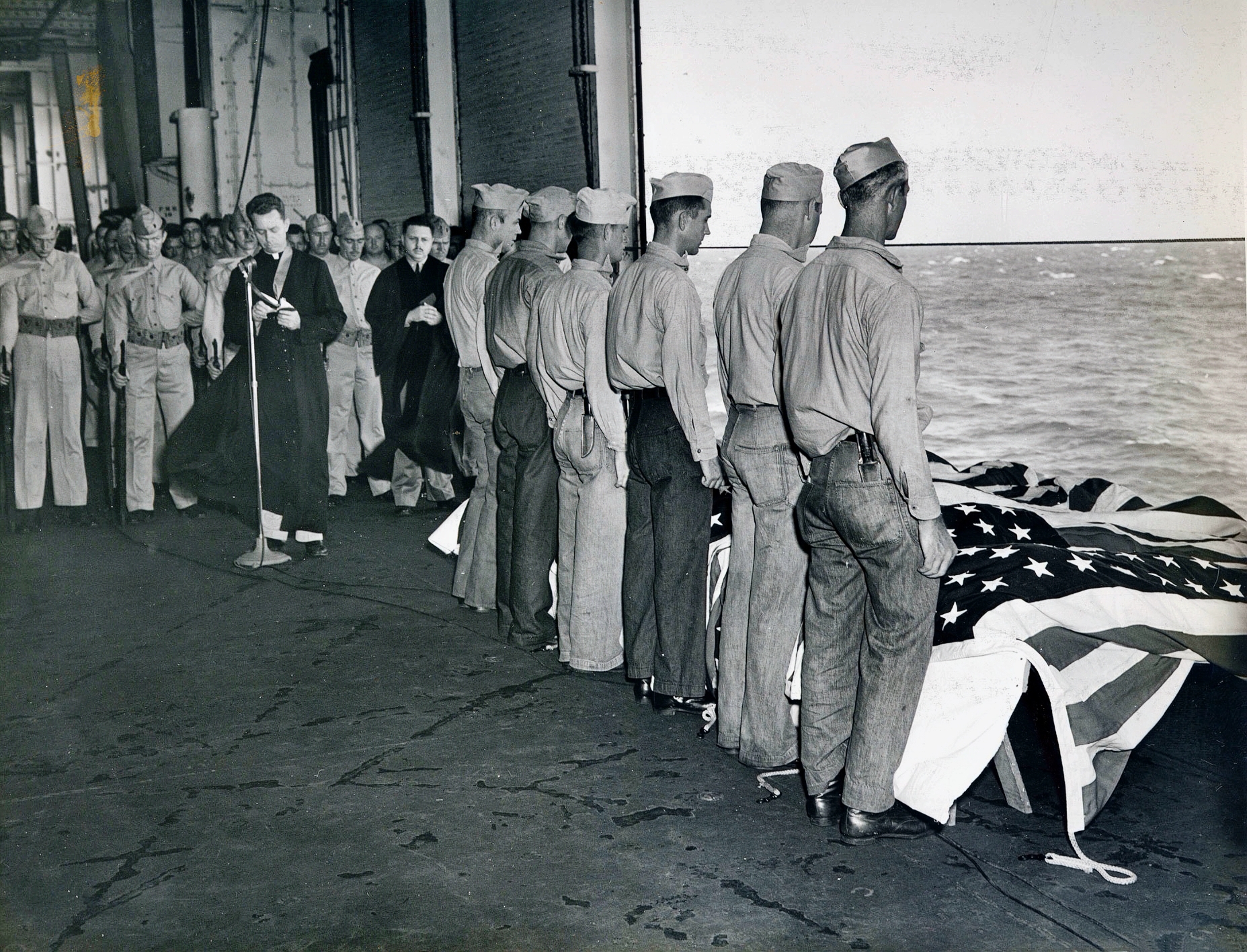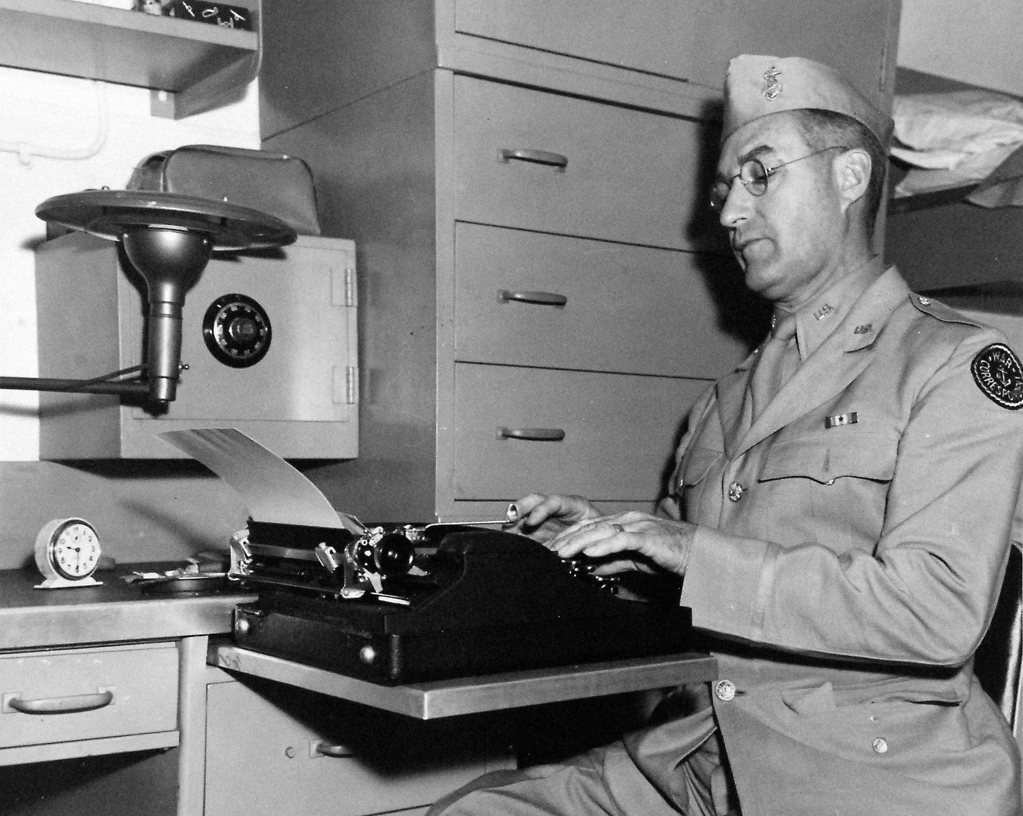 671k | American War Correspondent William J. Wheatley of Washington Evening Star aboard USS Intrepid (CV-11), photographed 6 October 1943. U.S. Navy photograph, now in the collections of the National Archives and Records Administration (NARA), # 80-G-209843. |
