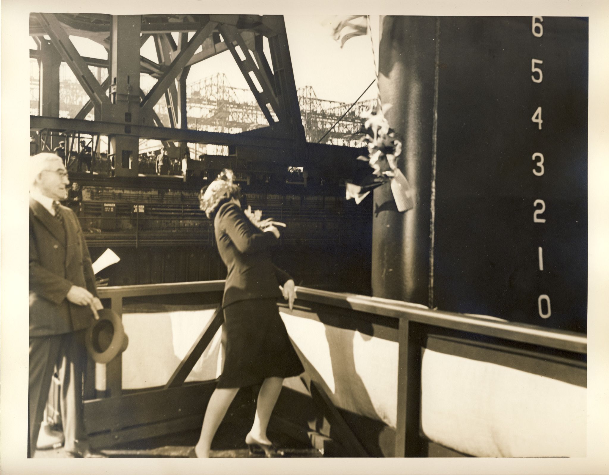 465k | Ship's sponsor, Mrs. John Howard Hoover (née Helen Braconier Smith), is in the middle, with the christening bottle in her hand. |