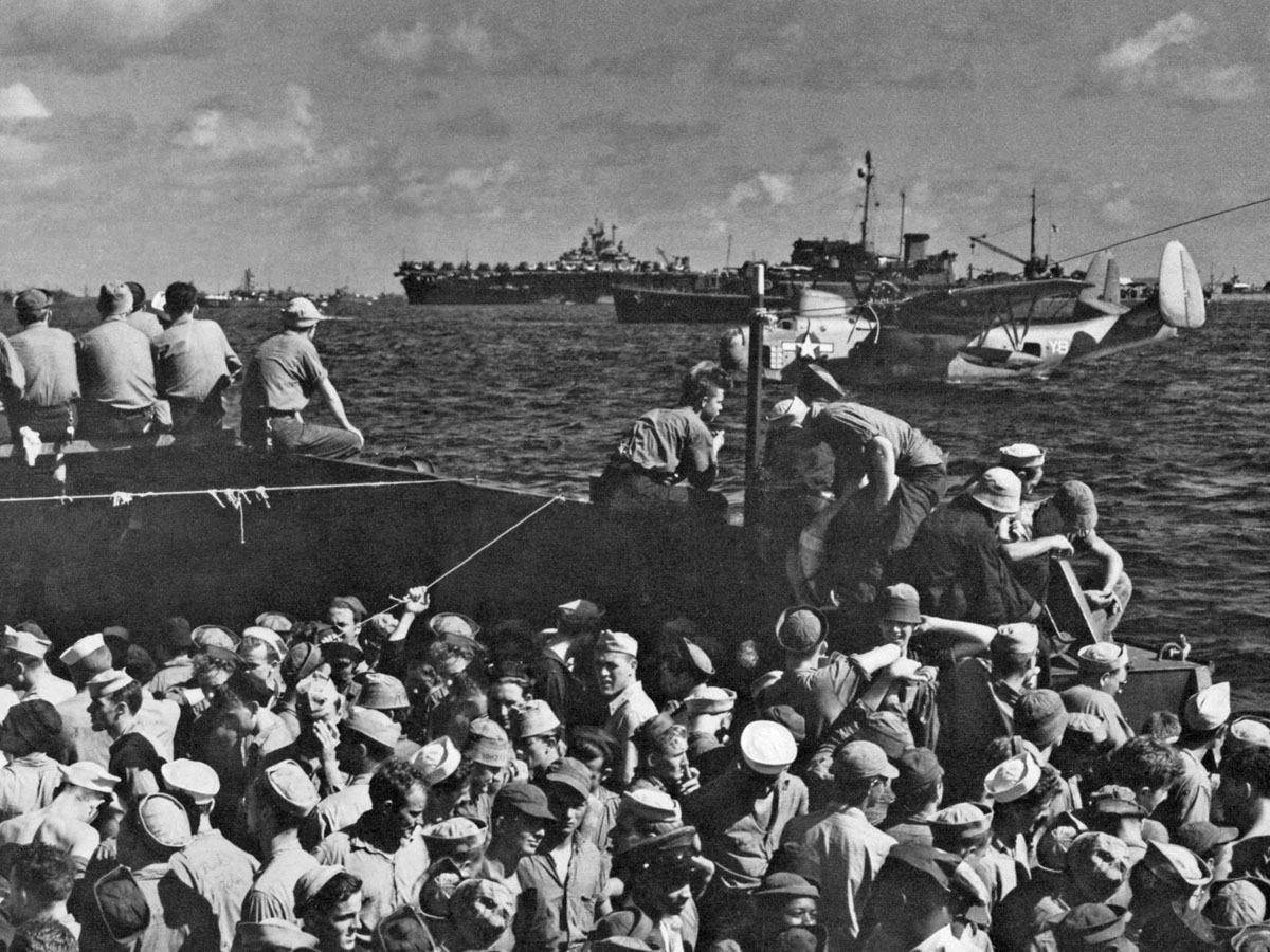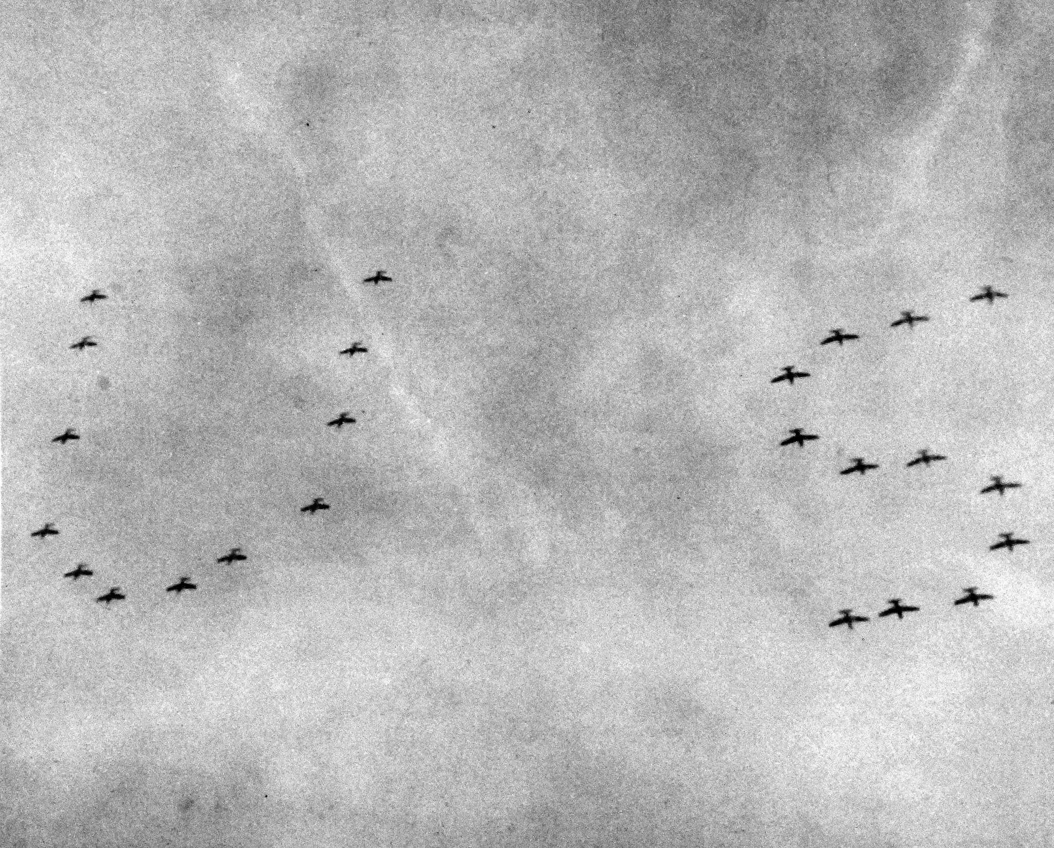 1.43M | The letters "U S" formed by SB2C-1 Helldivers of Bombing Squadron (VB) 8 of USS Intrepid (CV-11). Photographed 25 October 1943. U.S. Navy photograph, now in the collections of the National Archives and Records Administration (NARA), # 80-G-209850. |