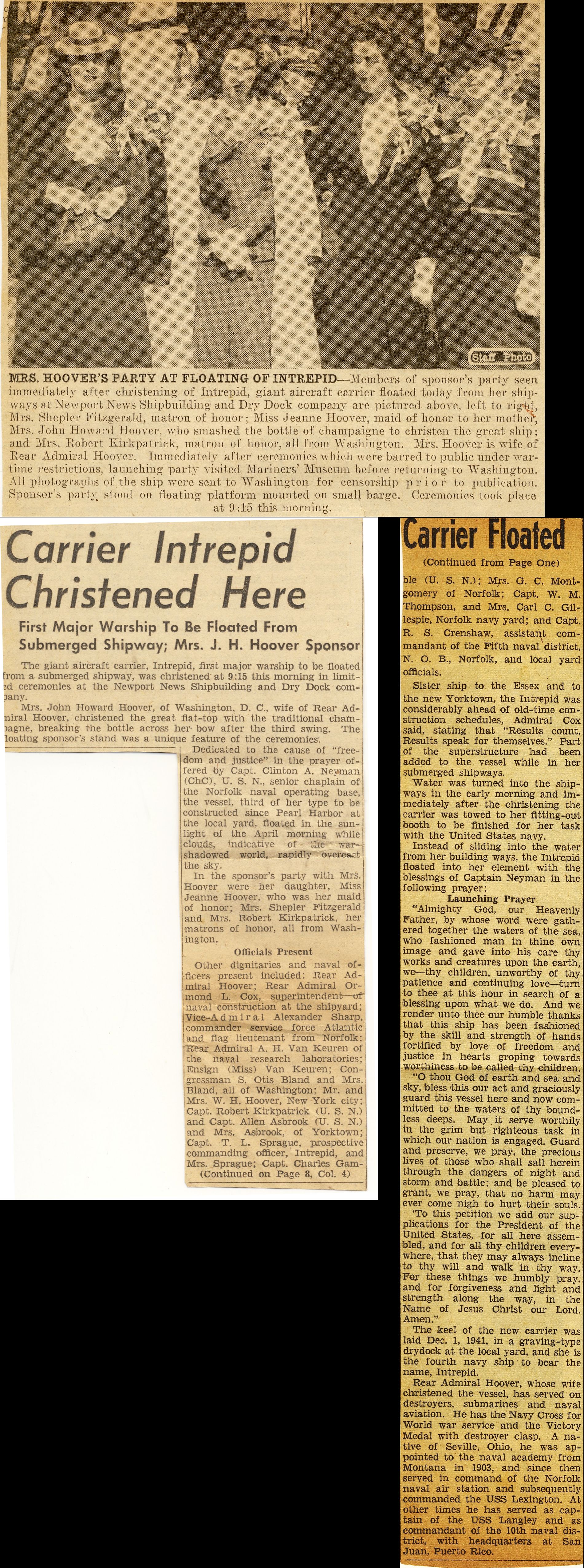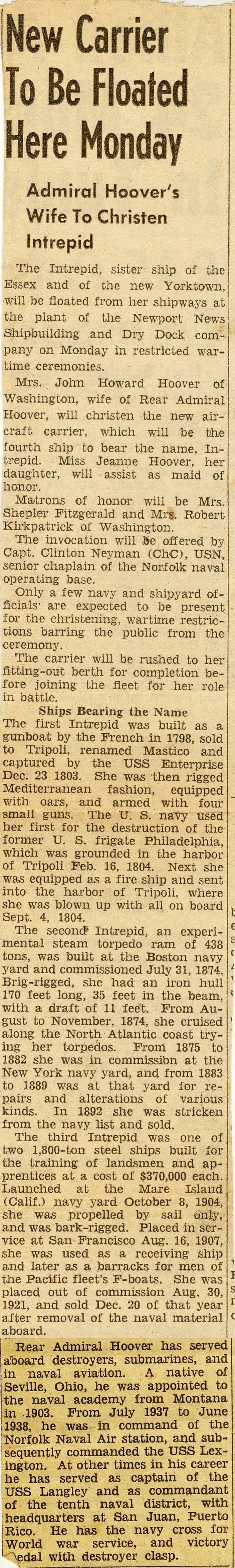 733k | "New Carrier To Be Floated Here Monday"—"Admiral Hoover's Wife To Christen Intrepid"—"Ships Bearing the Name" |