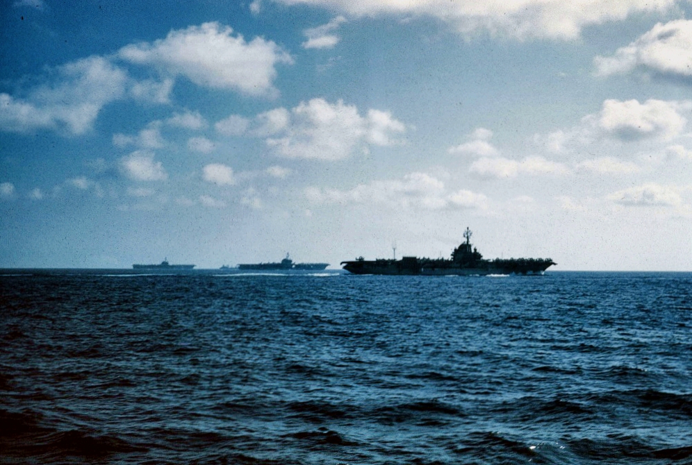 563k | USS Intrepid (CVA-11), with USS Saratoga (CVA-60) and USS Independence (CVA-62) in the background. This photo was likely taken on the same occasion and around the same time as the photo above. |