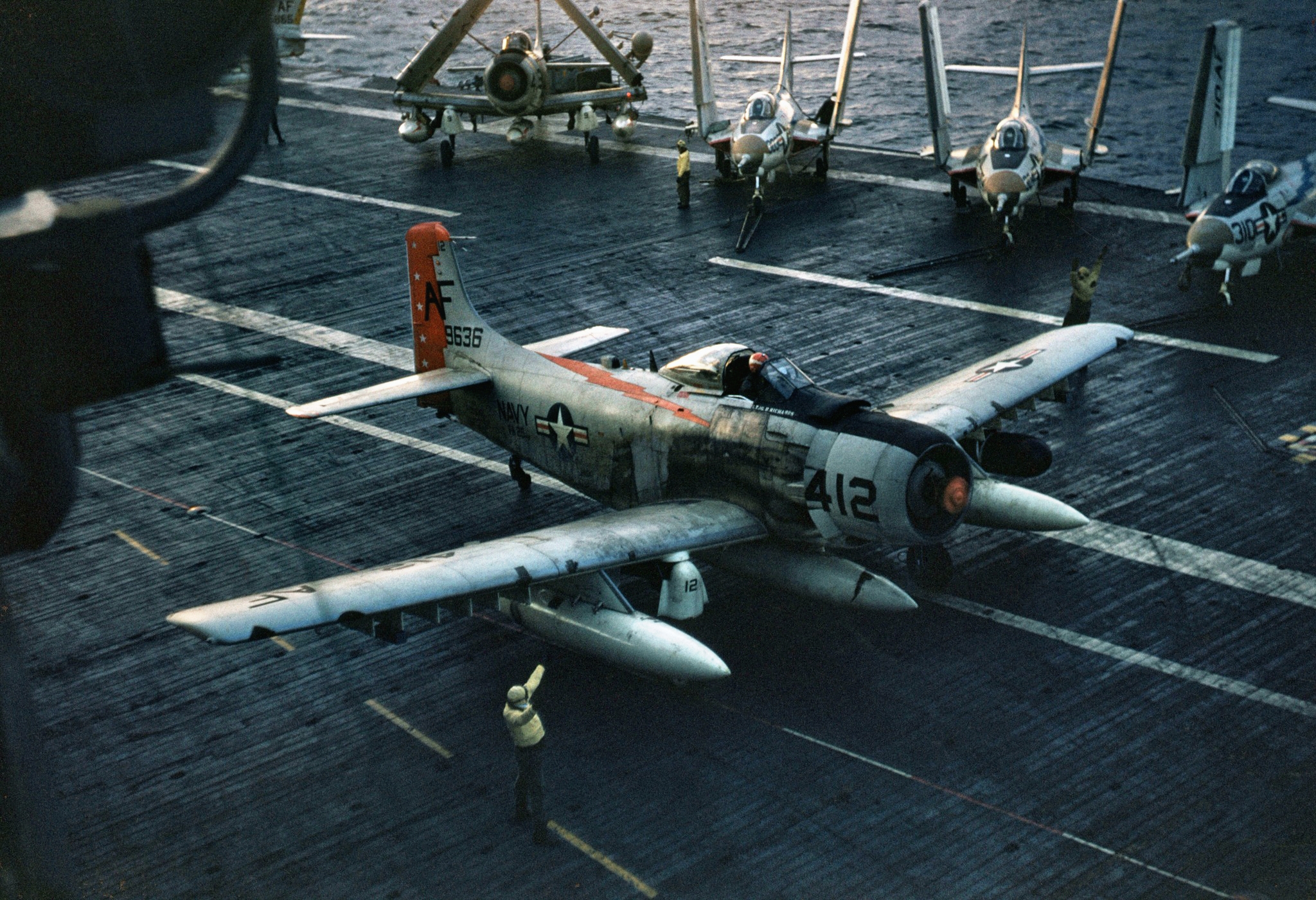1.84M | Aircraft of Carrier Air Group (CVG) 6 aboard USS Intrepid (CVA-11), circa 1957. F2H-3/4 Banshee, Fighter Squadron (VF) 71 (side numbers 1xx); FJ-3/3M Fury, VF-33 "Tarsiers" (2xx); AD-5W Skyraider, Carrier Airborne Early Warning Squadron (VAW) 12 "Bats" Det. 33 (7xx); AD-6 and AD-5N variants of the Skyraider, Attack Squadron (VA) 25 "Tigers" (4xx) and All-Weather Attack Squadron (VA(AW)) 33 "Night Hawks" Det. 33 (8xx). |