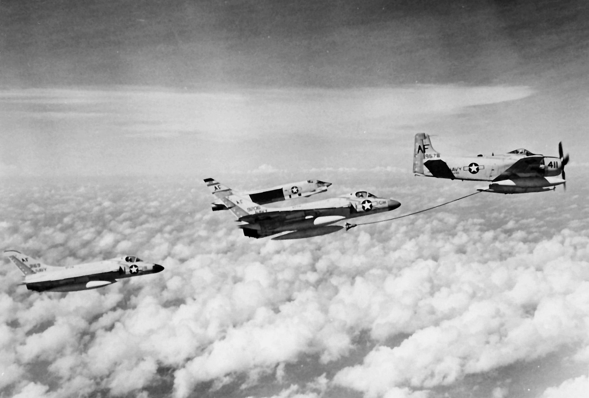 1.05M | A U.S. Navy Douglas AD-6 Skyraider (Bu 137537, modex AM-406) from Attack Squadron (VA) 42 "Green Pawns" refueling in flight a Grumman F9F-8P Cougar (BuNo 141688, GA-901) from Photographic Reconnaissance Squadron (VFP) 62 "Fighting Photos" Det. 33, 1958. Both squadrons were assigned to Air Task Group (ATG) 181 aboard the aircraft carrier USS Intrepid (CVA-11) for a deployment to the North Atlantic from 9 June to 8 August 1958. National Naval Aviation Museum photo, No. 1996.253.2671. |