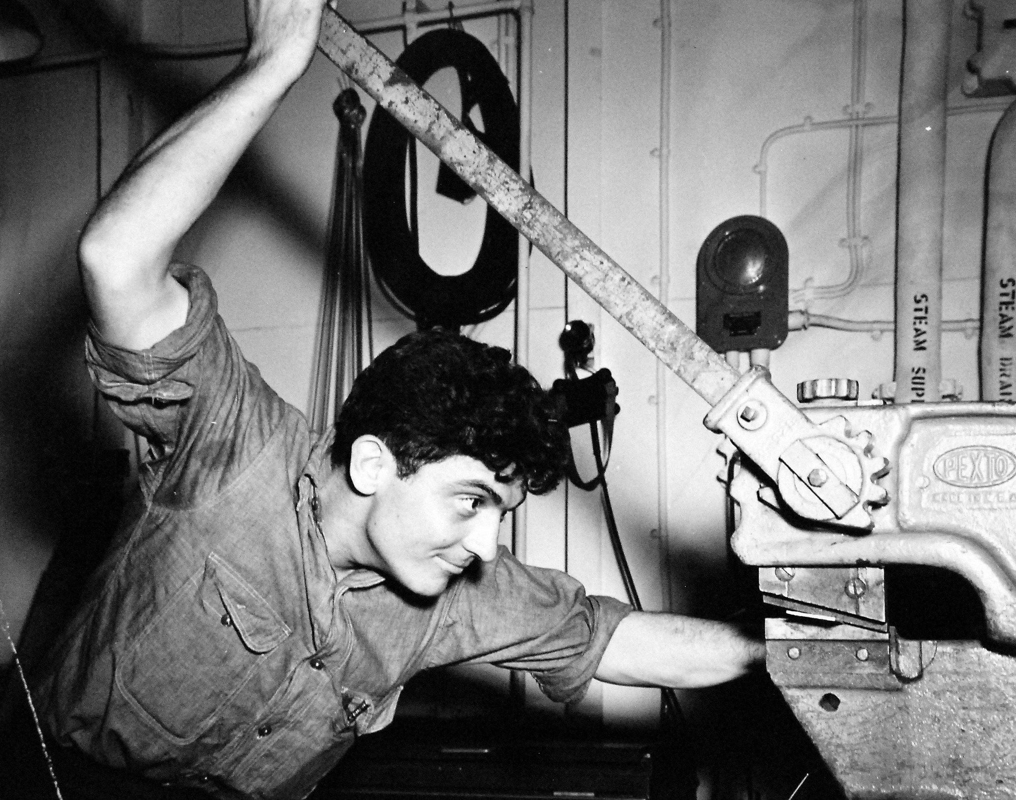 641k | SF1/c D.I. Cordea, working at shearing machine in ship fitters shop aboard USS Intrepid (CV-11). Photographed 30 October 1943. U.S. Navy photograph, now in the collections of the National Archives and Records Administration (NARA), # 80-G-209853. |