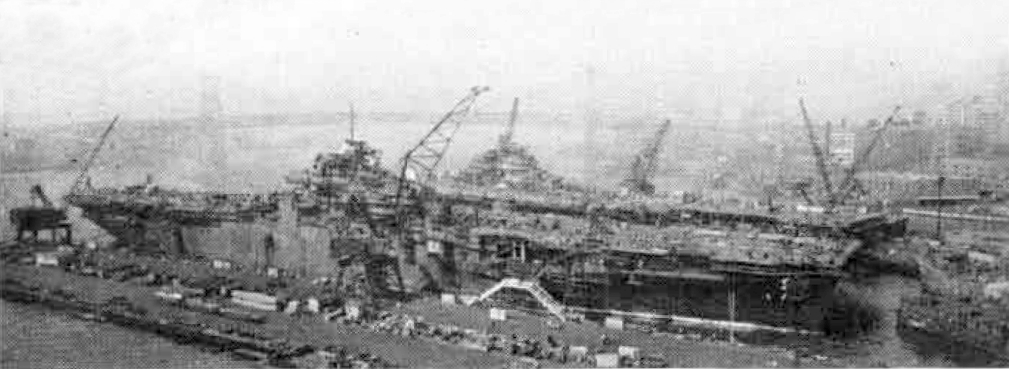 288k | USS Franklin (CV-13) under repair at New York Naval Shipyard, 27 October 1945 (the commissioning ceremony for USS Franklin D. Roosevelt (CVB-42) was being held on the opposite side of the pier). The entire flight deck and supporting upper hull was removed and rebuilt because of the extensive damage caused by two Japanese bombs that penetrated the flight deck on 19 March 1945, exploding on the hangar deck, igniting fuel and ordnance from the aircraft below decks. National Archives and Records Administration (NARA) photo, # 80-G-K-14557 (cropped). |