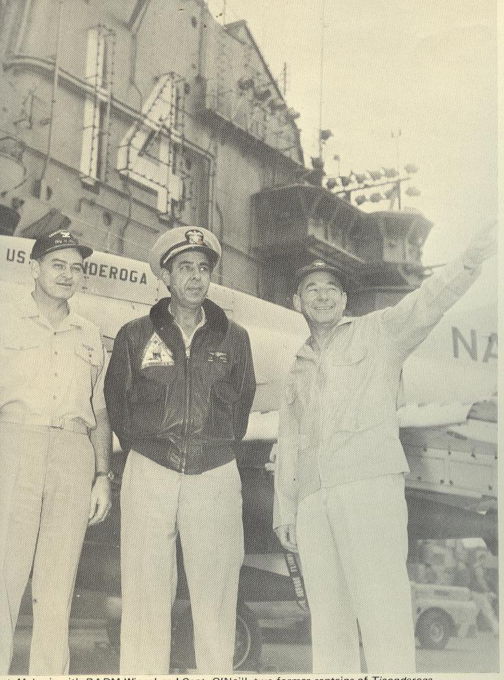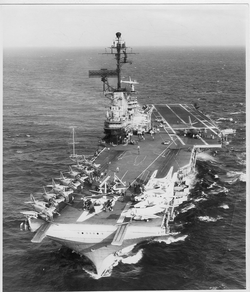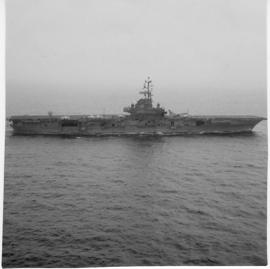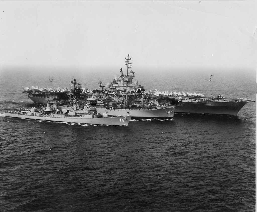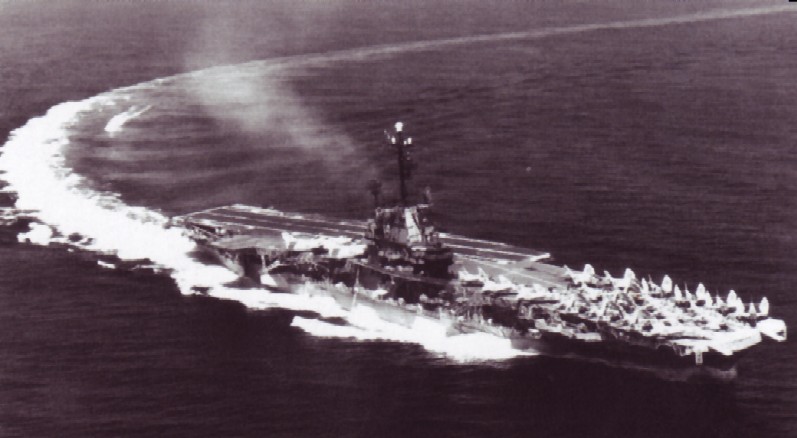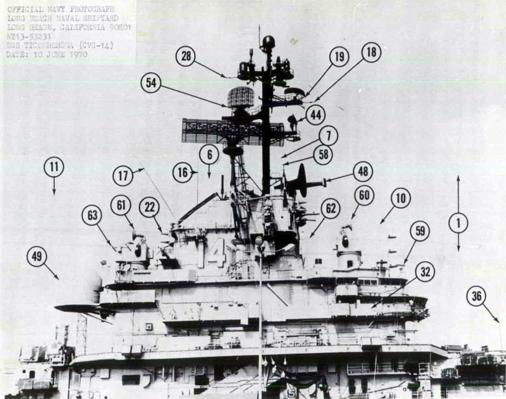 208k | North Island, San Diego, CA, September 3, 1970 — US President Richard M. Nixon passes USS Ticonderoga (CVS-14) on his way to meet Mexican President Gustavo Díaz Ordaz. (Special thanks to Kenneth E. Ratcliff, S-6 Div. aboard Ticonderoga; Denny Segar; and Chester Morris, aboard Ticonderoga 1967–1969, who helped research this photograph.) |