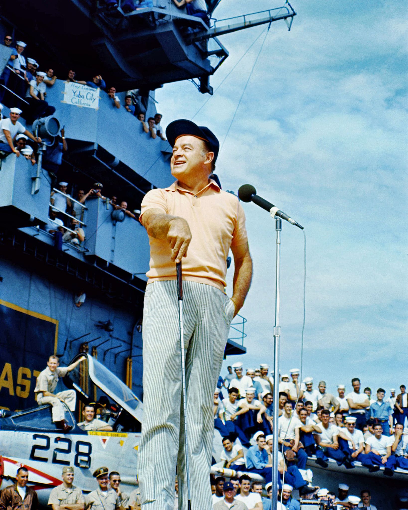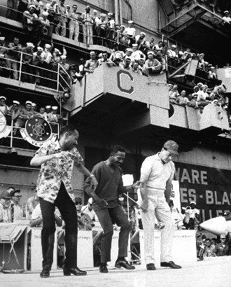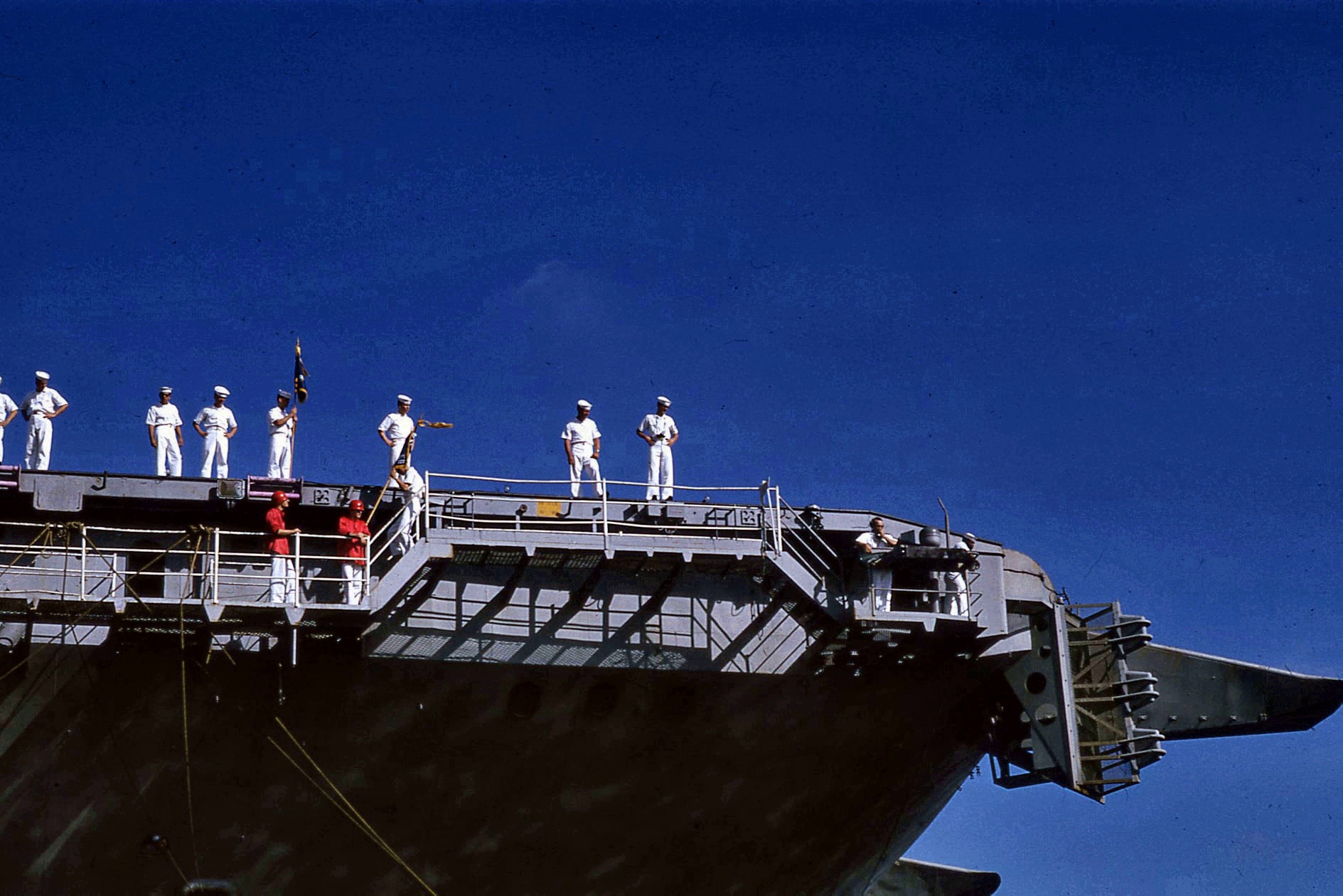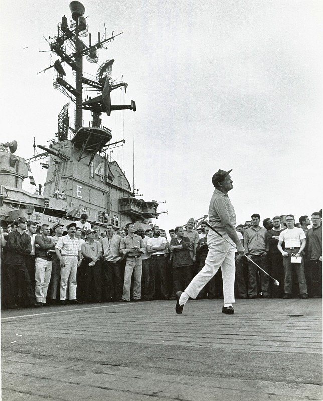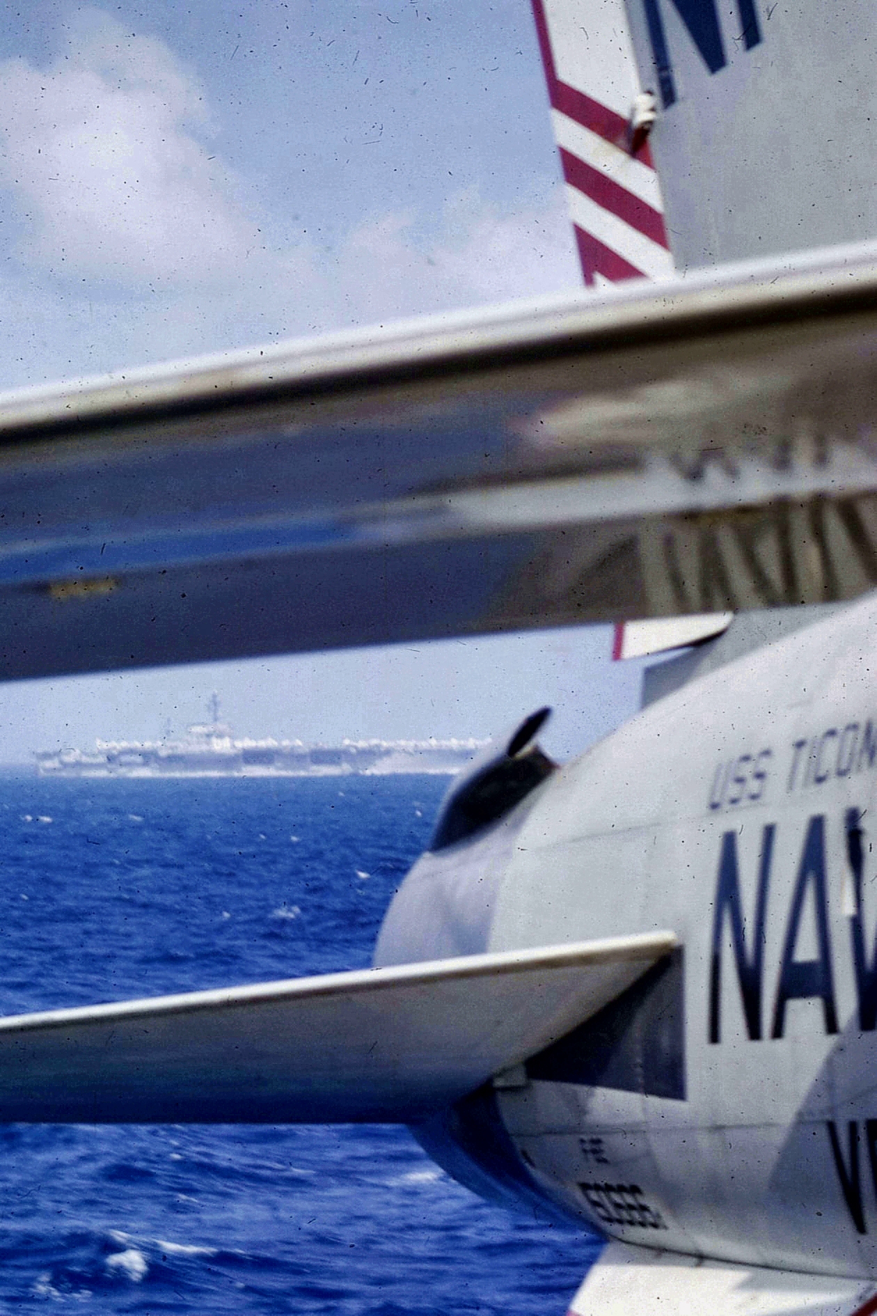 208k | North Island, San Diego, CA, September 3, 1970 — US President Richard M. Nixon passes USS Ticonderoga (CVS-14) on his way to meet Mexican President Gustavo Díaz Ordaz. (Special thanks to Kenneth E. Ratcliff, S-6 Div. aboard Ticonderoga; Denny Segar; and Chester Morris, aboard Ticonderoga 1967–1969, who helped research this photograph.) |