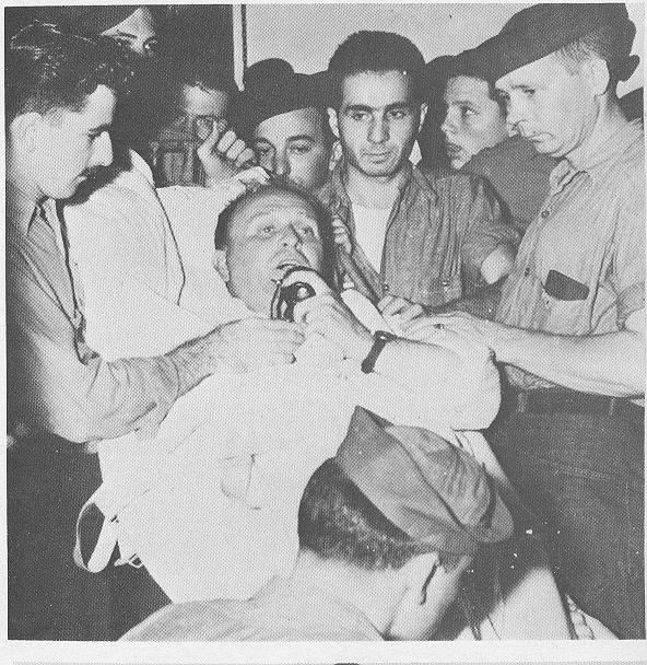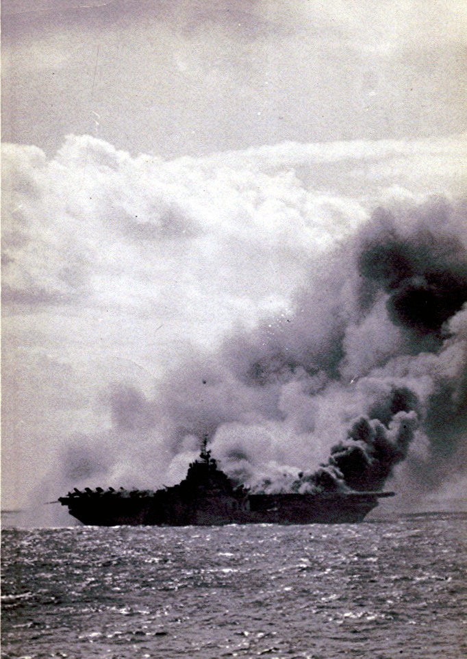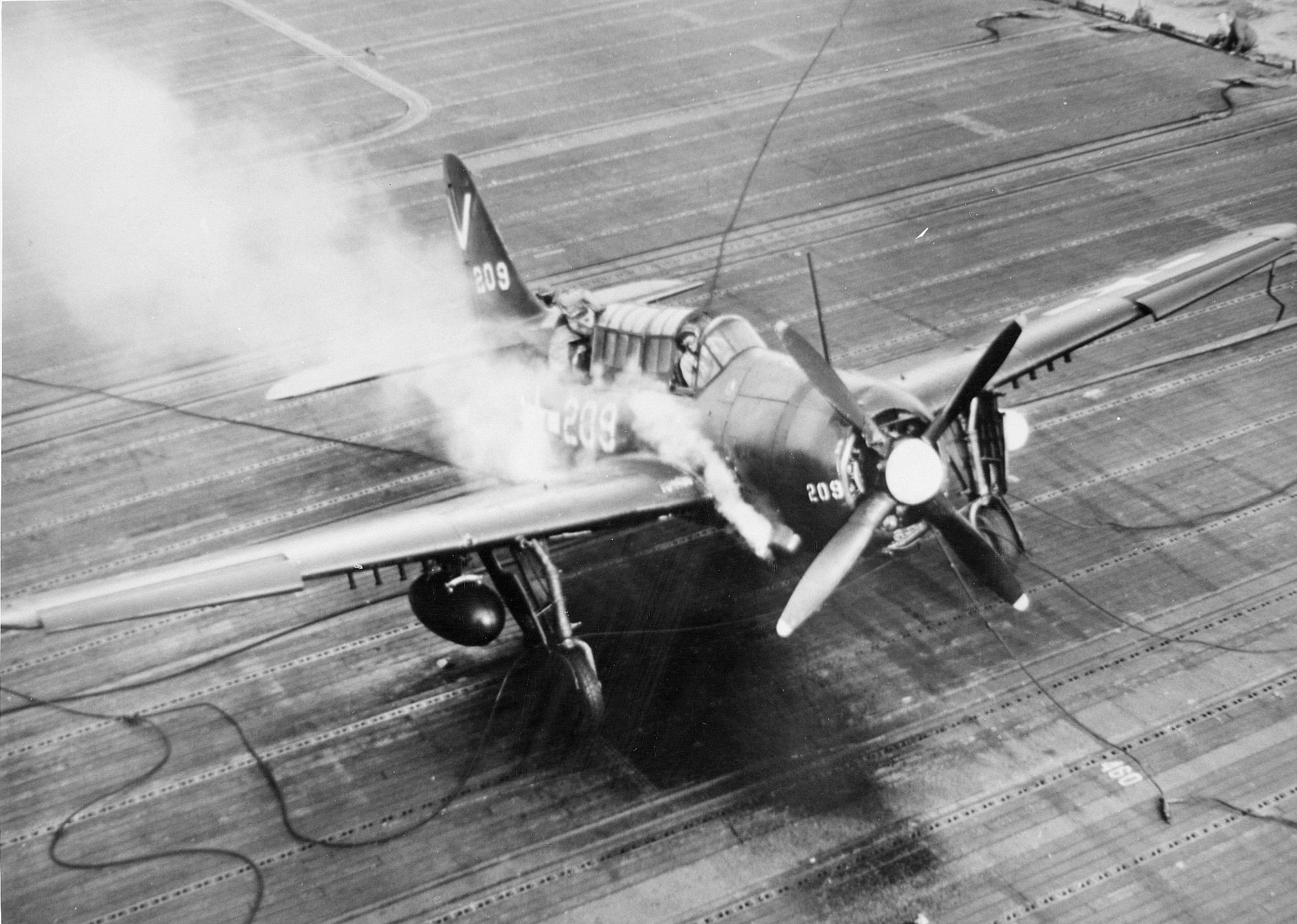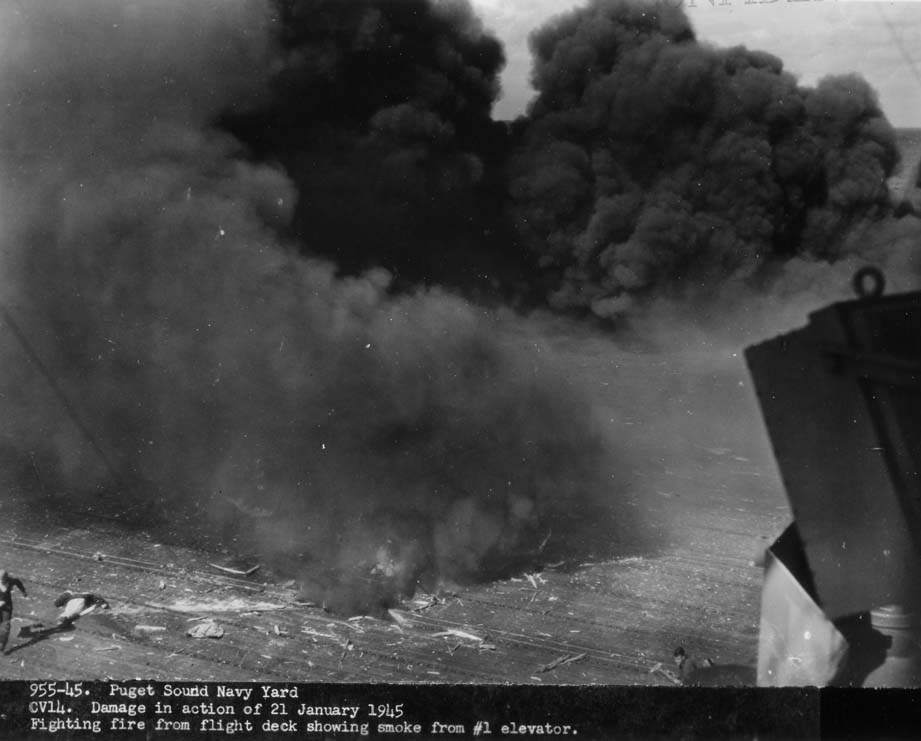 212k | "The date was 1 July 1944 while Ticonderoga was on her shakedown cruise in Trinidad. The pilot was ENS John G. Fraifogl who was only mildly injured in this incident." Deck log reads: "1717 Second plane aboard, F6F-4 [in fact, an F6F-5 Hellcat from VF-80, Squadron #4], BuAero serial number 58613, pilot Ensign J. G. FRAIFOGL, USNR, made normal landing, belly tank detached itself from plane, hit flight deck, ignited. Plane badly damaged—to be surveyed—." |