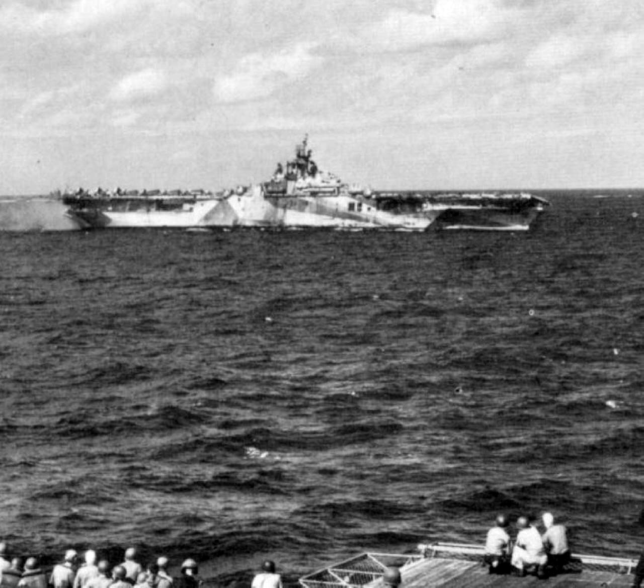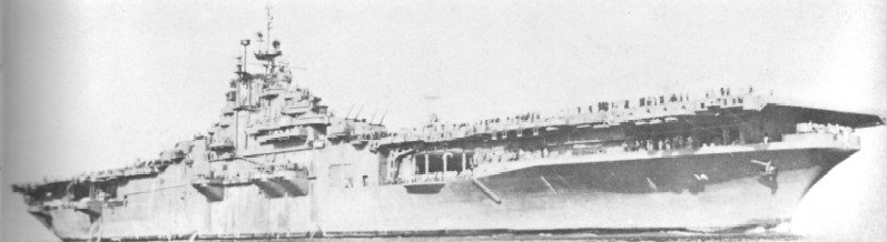 115k | Another photo taken on 30 May 1944. Flight deck was stained a dark blue, with the hull number painted in Dull Black and the dashed lines in light gray. Note the port elevator, opposite the island structure, is in the stowed position. A pair of 40mm quad mounts are visible on the forecastle, as well as a pair of catapults forward, on the flight deck. |
