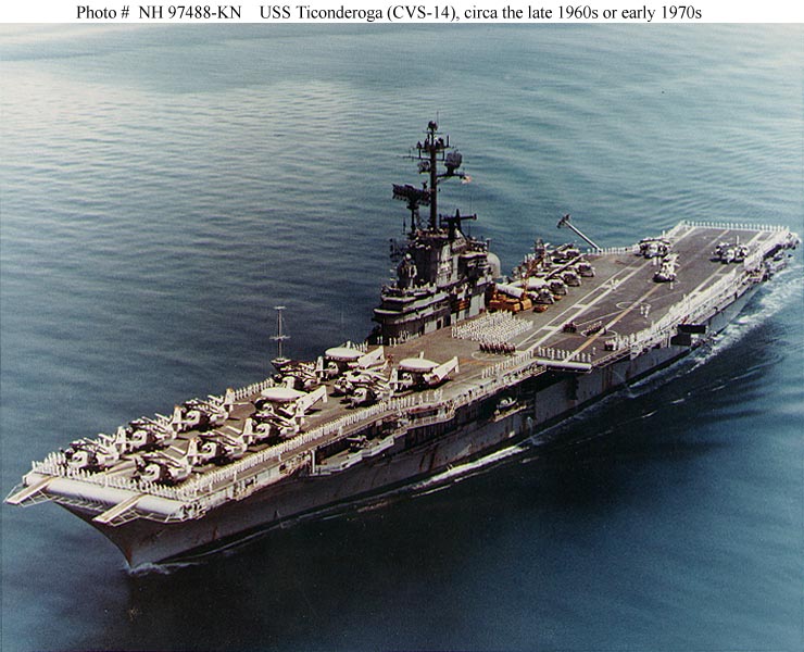 91k | USS Ticonderoga (CVS-14) underway off San Diego, California, after departing Naval Air Station, North Island, for her final Western Pacific deployment, 17 May 1972. Official U.S. Navy Photograph (# USN 1152586). |