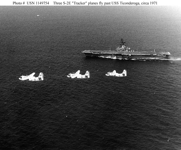 134k | Three S-2E Tracker aircraft, of Antisubmarine Squadron 33 (VS-33) fly past USS Ticonderoga (CVS-14), off San Diego, California, circa late 1971. At that time VS-33 had completed eleven years of accident-free flying. Photo was received by the Naval Photographic DMA in November 1971. Official U.S. Navy Photograph (# USN 1149754). |