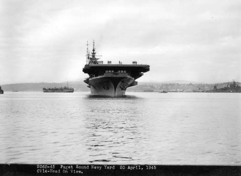 105k | Ticonderoga (CV-14), port quarter, bow view, 22 April 1944, Newport News Shipbuilding & Dry Dock Co. photo. |