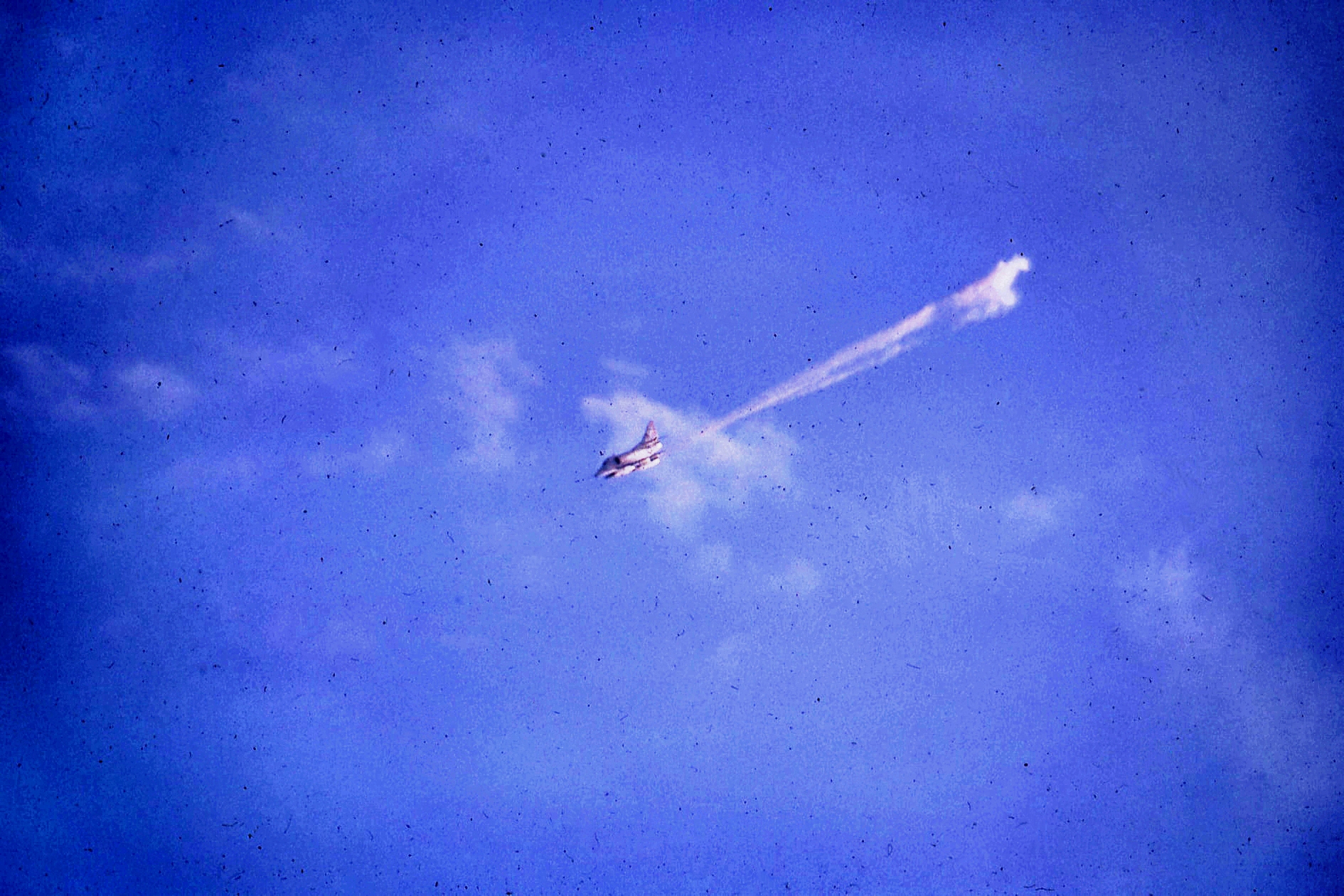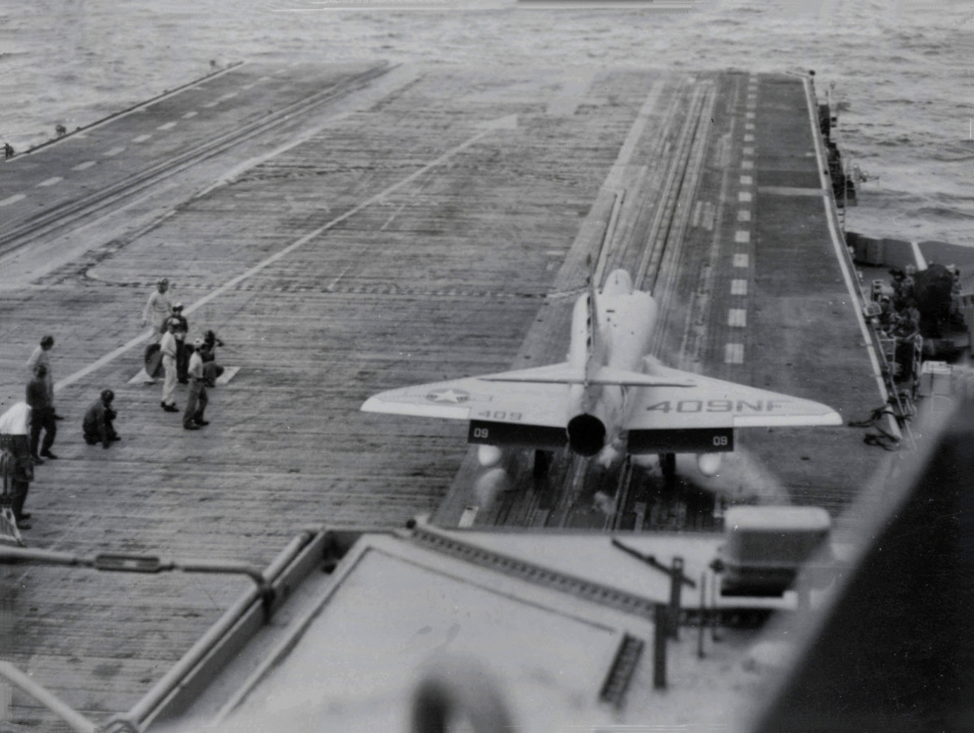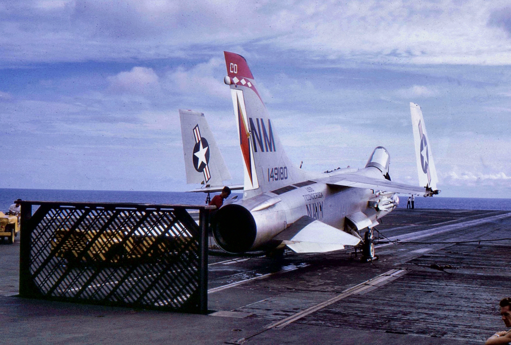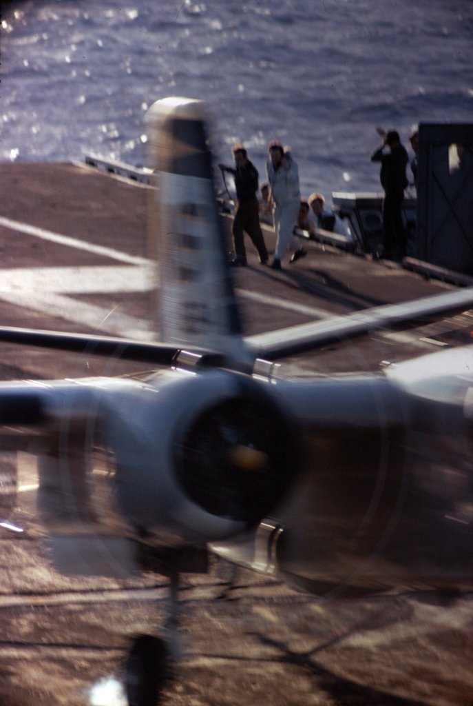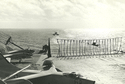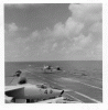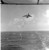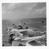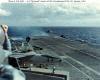 151k | VF-162 "Hunters" F-8J Crusader launching with afterburner from USS Ticonderoga (CVA-14) during combat operations, Gulf of Tonkin, 1969. (All that can be seen is the AB flame over the starboard bow.) |