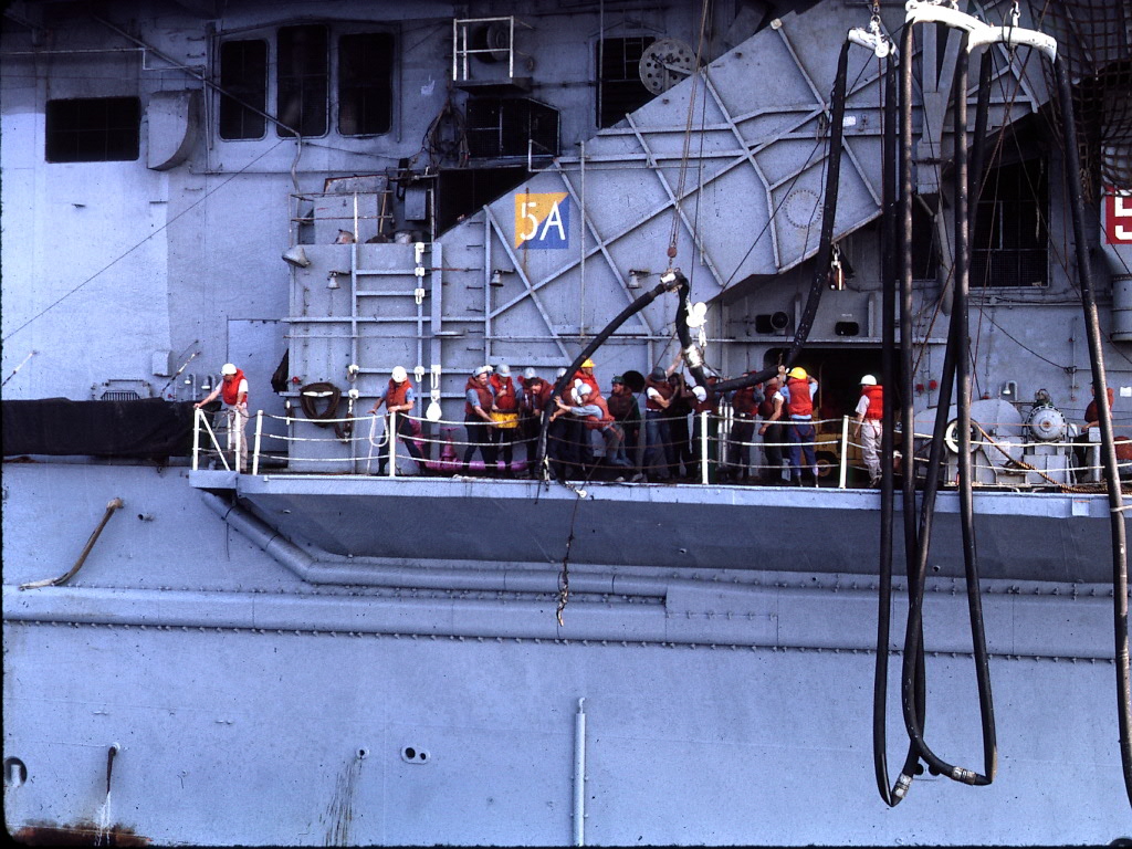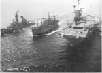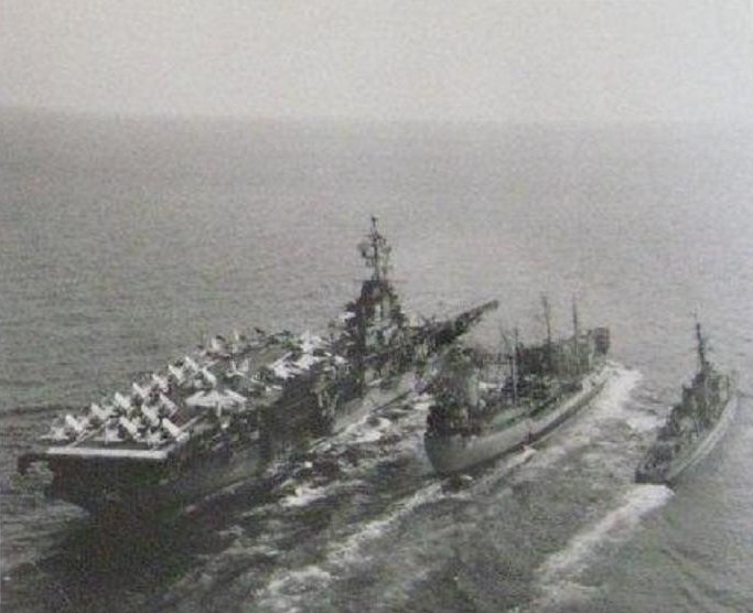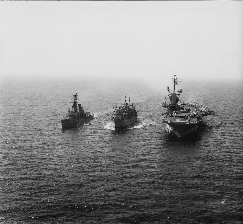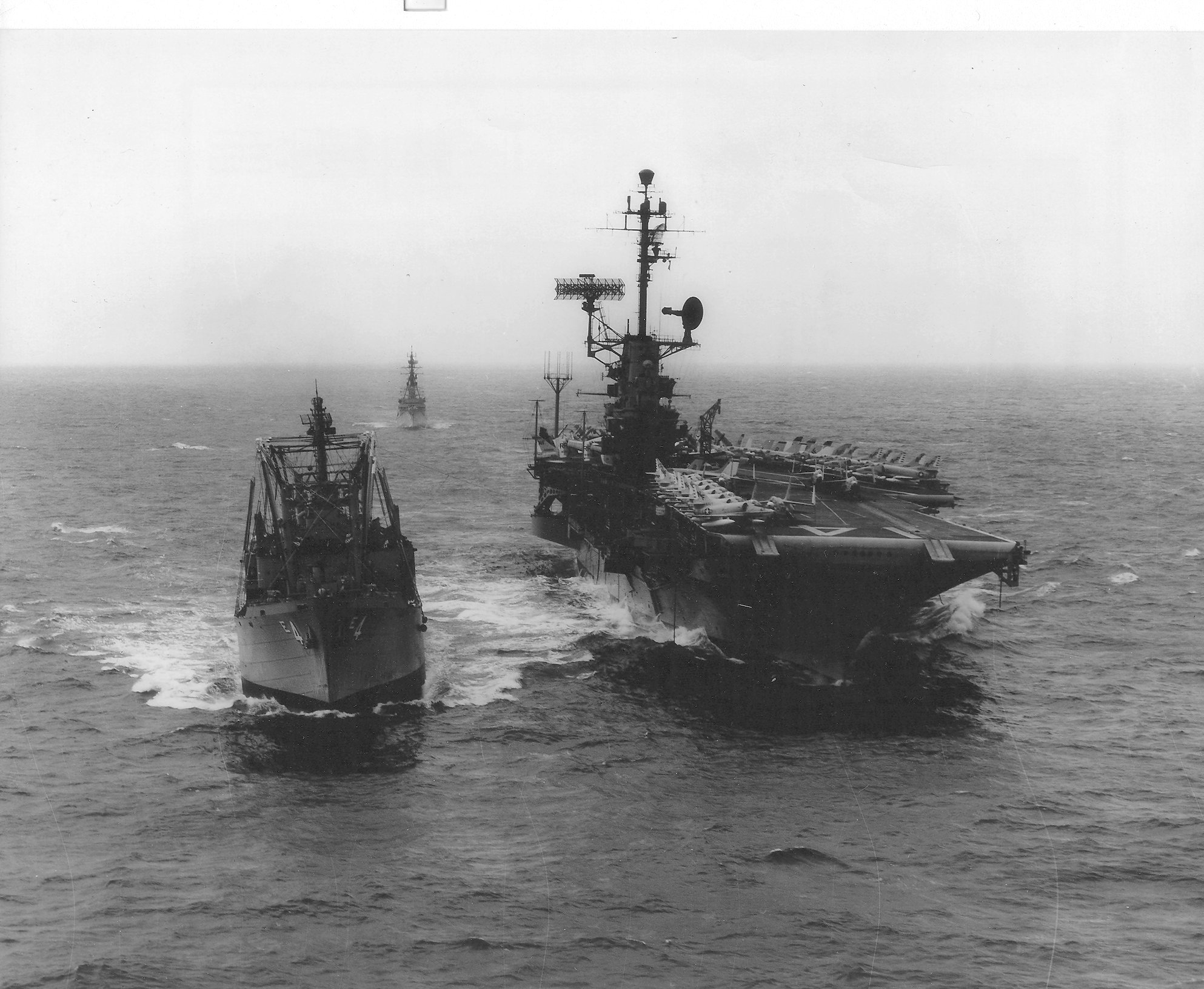306k | USS Hassayampa (AO-145) refueling USS Ticonderoga (CVS-14) and a Knox-class destroyer escort. Ticonderoga, with assigned Carrier Anti-Submarine Air Group (CVSG) 53, was deployed to the Western Pacific from 17 May to 29 July 1972. US Navy photo from the Ticonderoga 1972 cruise book. |