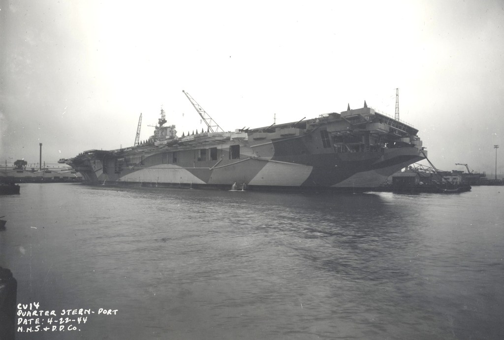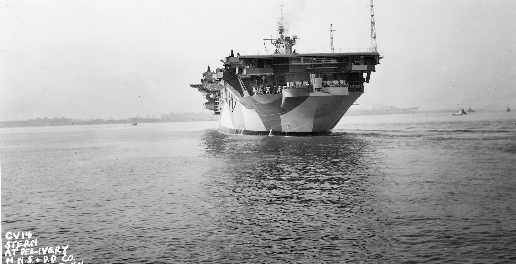 320k | USS Ticonderoga (CV-14), stern, at delivery. Newport News & Dry Dock Company. Date: 8 May 1944. |
