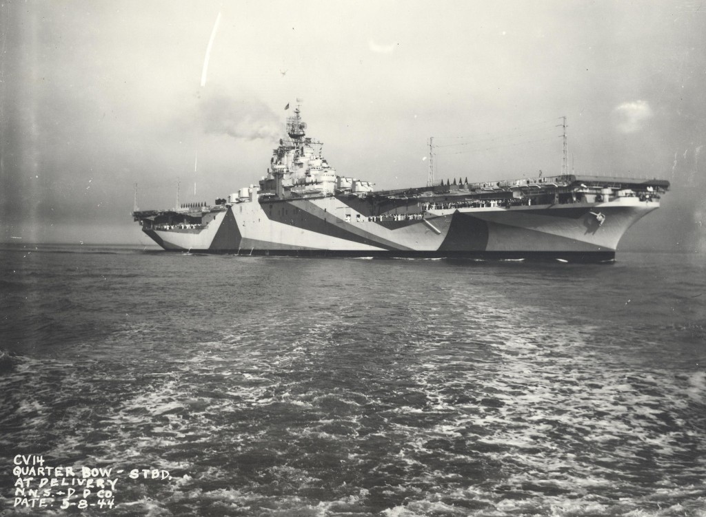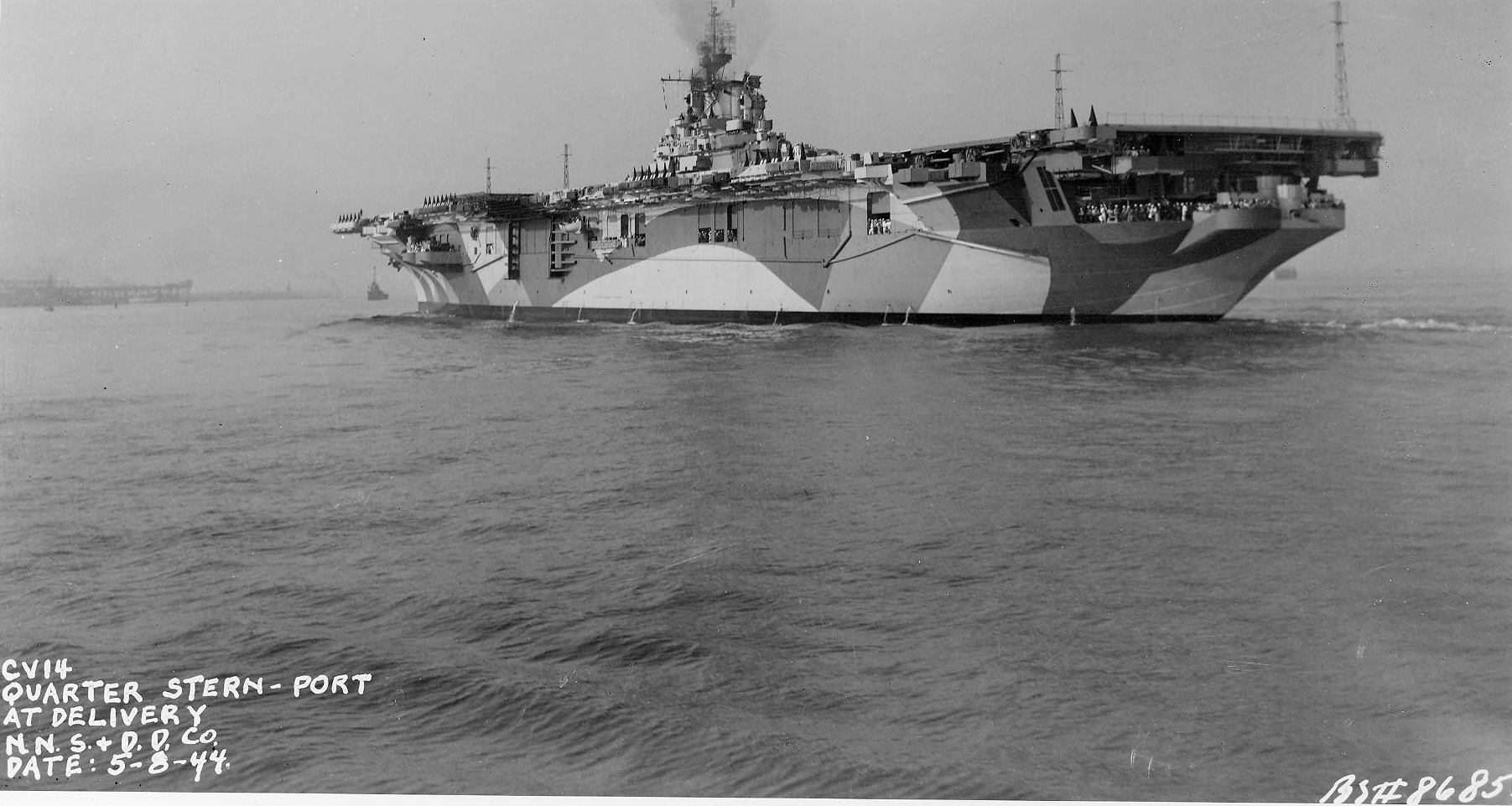 503k | USS Ticonderoga (CV-14), starboard bow, at delivery. Newport News & Dry Dock Company. Date: 8 May 1944. Camouflage Measure 33, Design 10A. Vertical colors were: Navy Blue (5-N), Ocean Gray (5-O), and Light Gray (5-L). |
