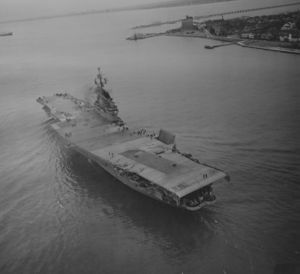 620k | USS Ticonderoga (CV-14), quarter stern-port, at delivery. Newport News & Dry Dock Company. Date: 8 May 1944. |