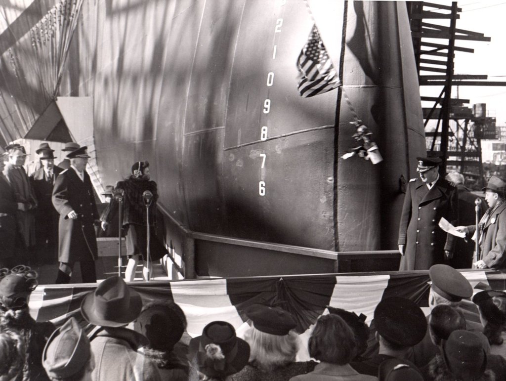 136k | [Monday, 7 February 1944]. "Newport News, Va.—At launching ceremonies for the newest U.S. Navy aircraft carrier Ticonderoga, Miss Stephanie Sarah Pell of Pelham Manor, N.Y., swings the champagne bottle past the warship's huge bow—a clean miss. On the next try, however, Miss Pell's aim improved and the flattop was properly christened." |