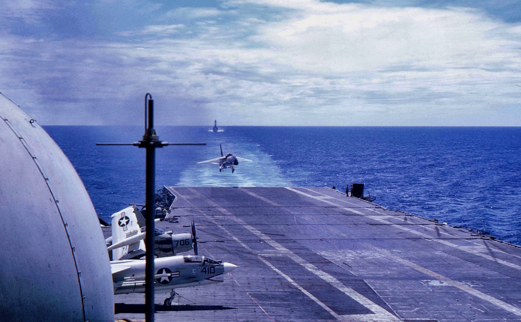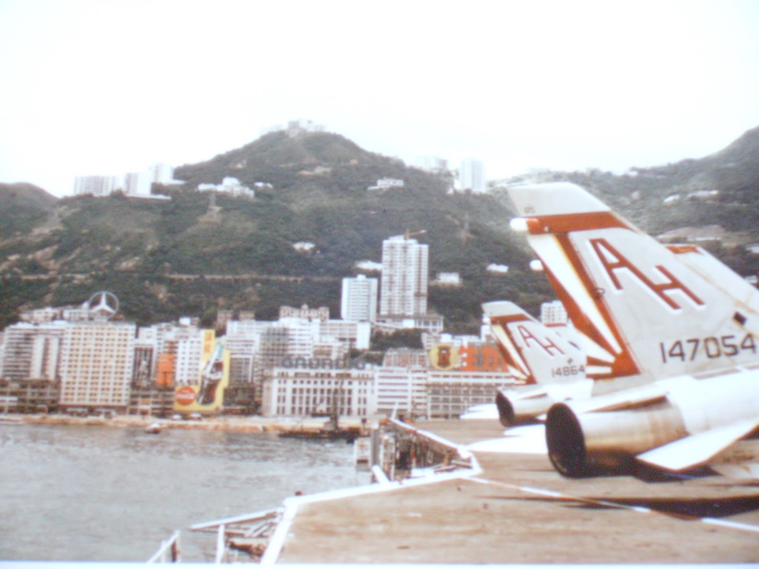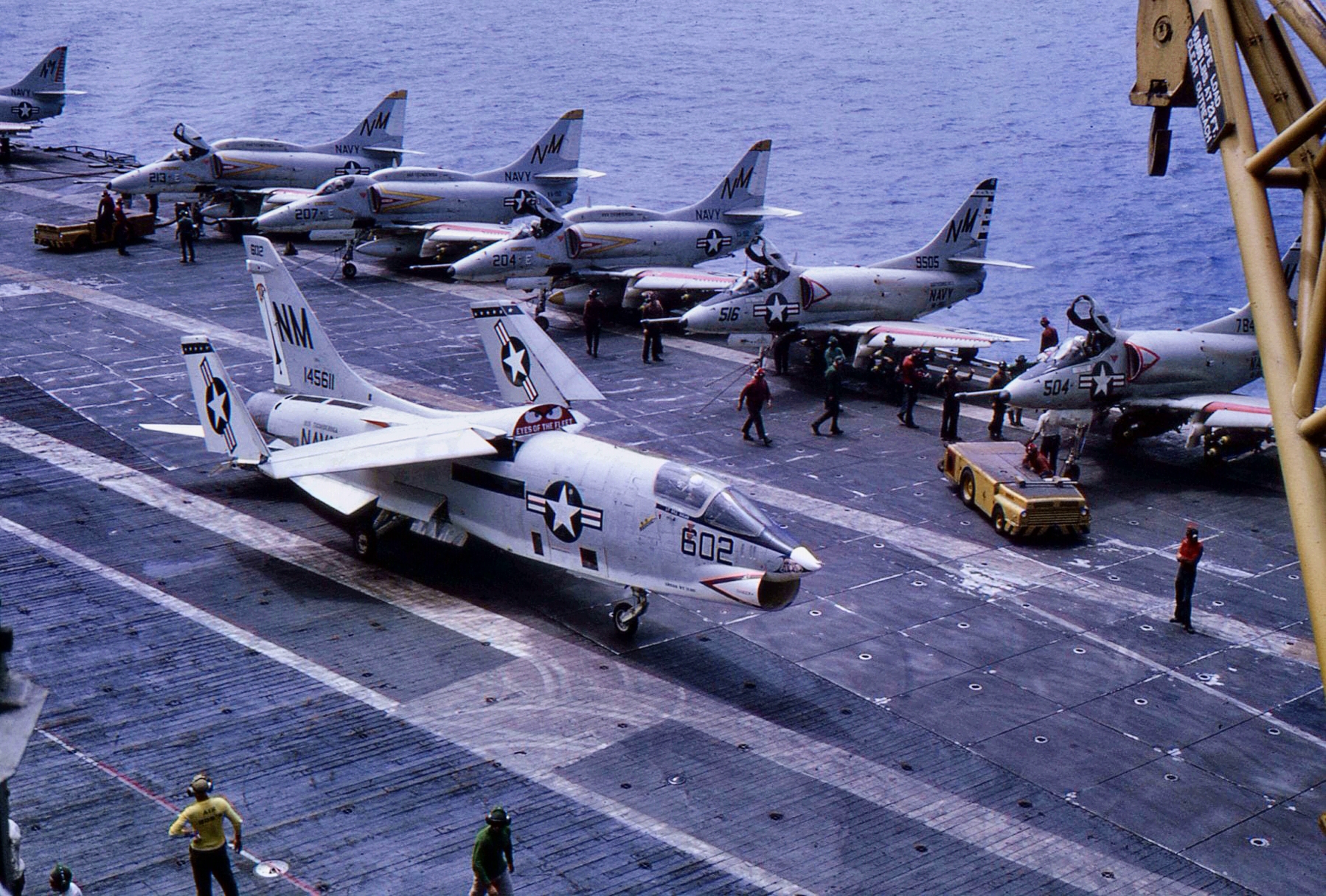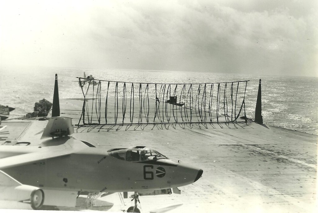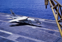 41k | VA-87 "Golden Warriors" A-7B Corsair II (BuNo 154424, modex AH-312) shuttling to cat. (Converted to TA-7C in 1976, put into storage in 1991 and sold to the Greek Air Force in 1995.) |