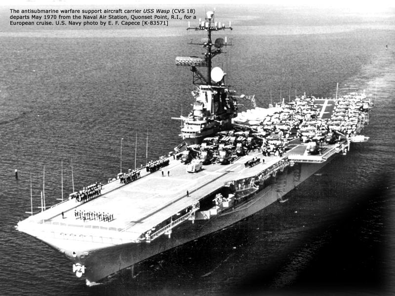 94k | The antisubmarine warfare support carrier USS Wasp (CVS-18) departs May 1970 from the Naval Air Station, Quonset Point, R.I., for a European cruise. US Navy photo by E. F. Capece (# K-83571). |